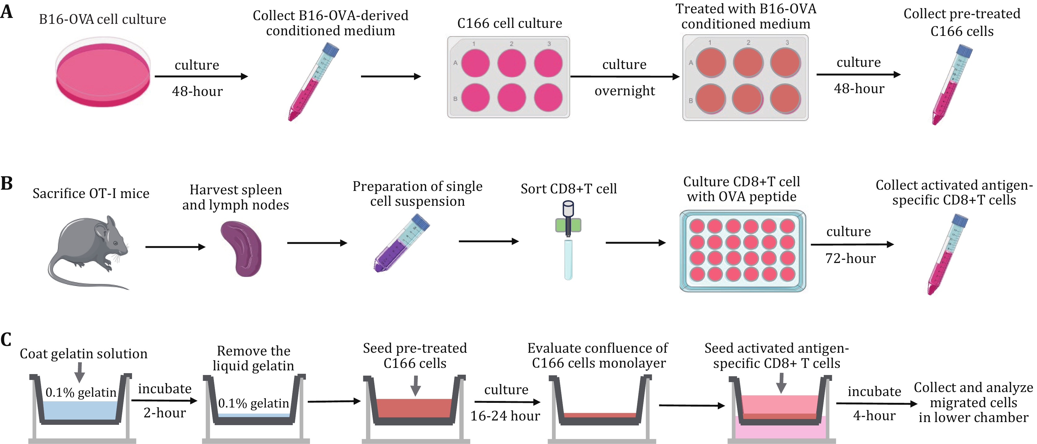 T cells play a key role in tumor immune surveillance. Trafficking of T cells to the tumor microenvironment is critical for the success of cancer immunotherapies. The process of T cell trafficking involves a sequence of steps: initial rolling along the endothelium, firm adhesion, subsequent extravasation, and directed chemotactic movement toward the tumor site. It is emerging that tumor vasculature constitutes an important barrier to T cell infiltration. In this protocol, we summarize a method for assessing antigen-specific CD8+T cell trans-endothelial migration in vitro using the Transwell system. This technique is vital for studying the mechanisms of T cell extravasation and their interactions with the vascular endothelium, and provides a controllable experimental setup to investigate T cell trans-endothelial migration.