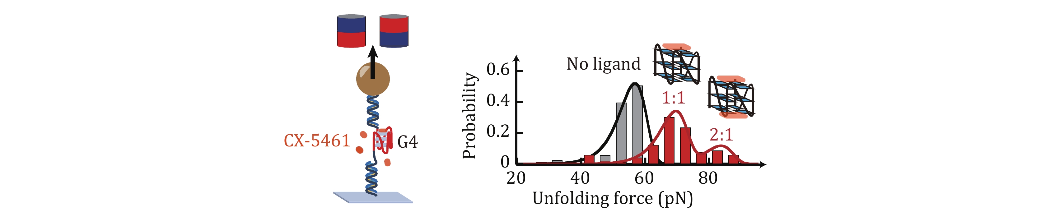 CX-5461, also known as pidnarulex, is a strong G4 stabilizer and has received FDA fast-track designation for BRCA1- and BRCA2- mutated cancers. However, quantitative measurements of the unfolding rates of CX-5461-G4 complexes which are important for the regulation function of G4s, remain lacking. Here, we employ single-molecule magnetic tweezers to measure the unfolding force distributions of c-MYC G4s in the presence of different concentrations of CX-5461. The unfolding force distributions exhibit three discrete levels of unfolding force peaks, corresponding to three binding modes. In combination with a fluorescent quenching assay and molecular docking to previously reported ligand-c-MYC G4 structure, we assigned the ~69 pN peak corresponding to the 1:1 (ligand:G4) complex where CX-5461 binds at the G4’s 5'-end. The ~84 pN peak is attributed to the 2:1 complex where CX-5461 occupies both the 5' and 3'. Furthermore, using the Bell-Arrhenius model to fit the unfolding force distributions, we determined the zero-force unfolding rates of 1:1, and 2:1 complexes to be (2.4 ± 0.9) × 10−8 s−1 and (1.4 ± 1.0) × 10−9 s−1 respectively. These findings provide valuable insights for the development of G4-targeted ligands to combat c-MYC-driven cancers.