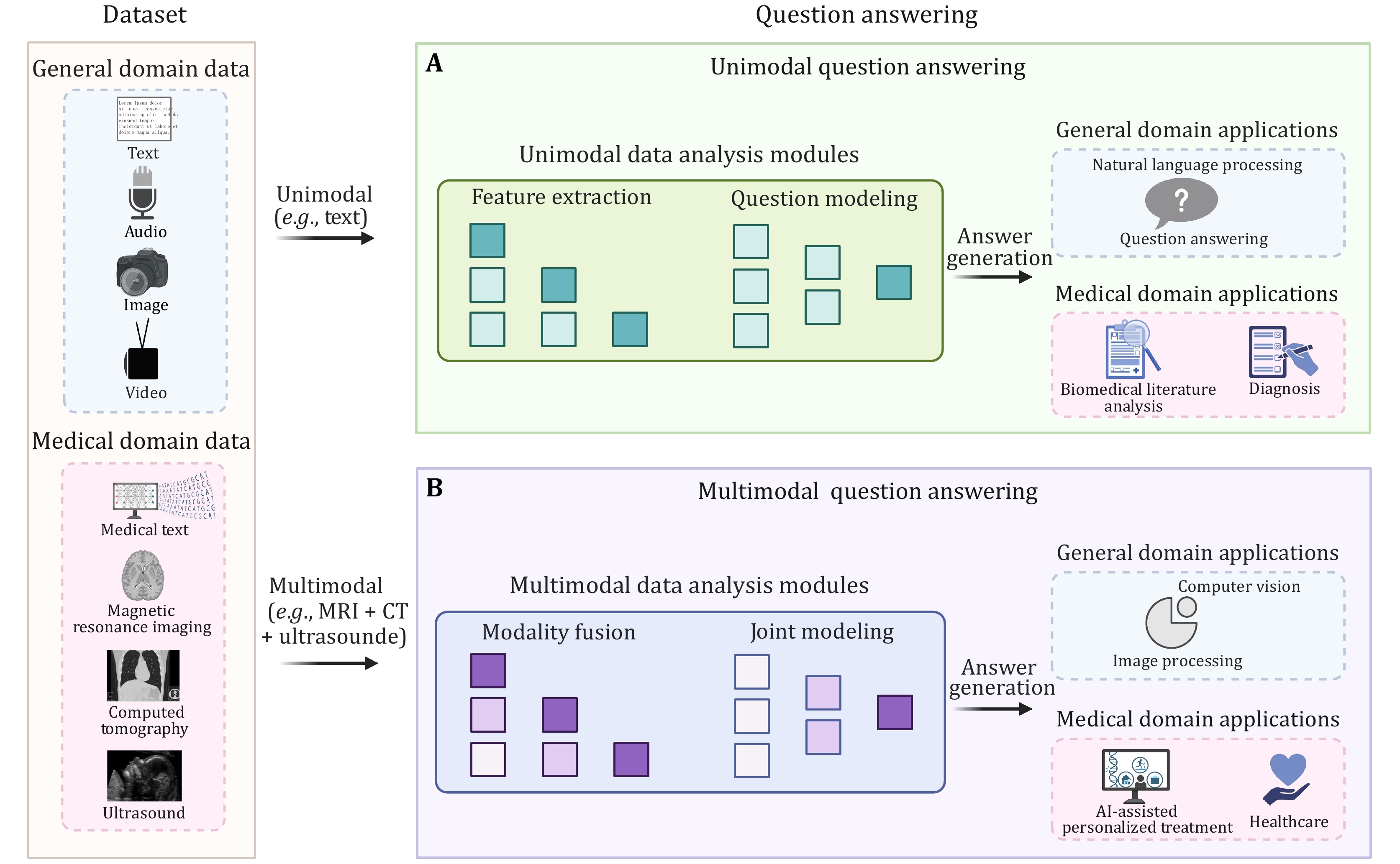 ChatGPT explores a strategic blueprint of question answering (QA) to deliver medical diagnoses, treatment recommendations, and other healthcare support. This is achieved through the increasing incorporation of medical domain data via natural language processing (NLP) and multimodal paradigms. By transitioning the distribution of text, images, videos, and other modalities from the general domain to the medical domain, these techniques have accelerated the progress of medical domain question answering (MDQA). They bridge the gap between human natural language and sophisticated medical domain knowledge or expert-provided manual annotations, handling large-scale, diverse, unbalanced, or even unlabeled data analysis scenarios in medical contexts. Central to our focus is the utilization of language models and multimodal paradigms for medical question answering, aiming to guide the research community in selecting appropriate mechanisms for their specific medical research requirements. Specialized tasks such as unimodal-related question answering, reading comprehension, reasoning, diagnosis, relation extraction, probability modeling, and others, as well as multimodal-related tasks like vision question answering, image captioning, cross-modal retrieval, report summarization, and generation, are discussed in detail. Each section delves into the intricate specifics of the respective method under consideration. This paper highlights the structures and advancements of medical domain explorations against general domain methods, emphasizing their applications across different tasks and datasets. It also outlines current challenges and opportunities for future medical domain research, paving the way for continued innovation and application in this rapidly evolving field. This comprehensive review serves not only as an academic resource but also delineates the course for future probes and utilization in the field of medical question answering.