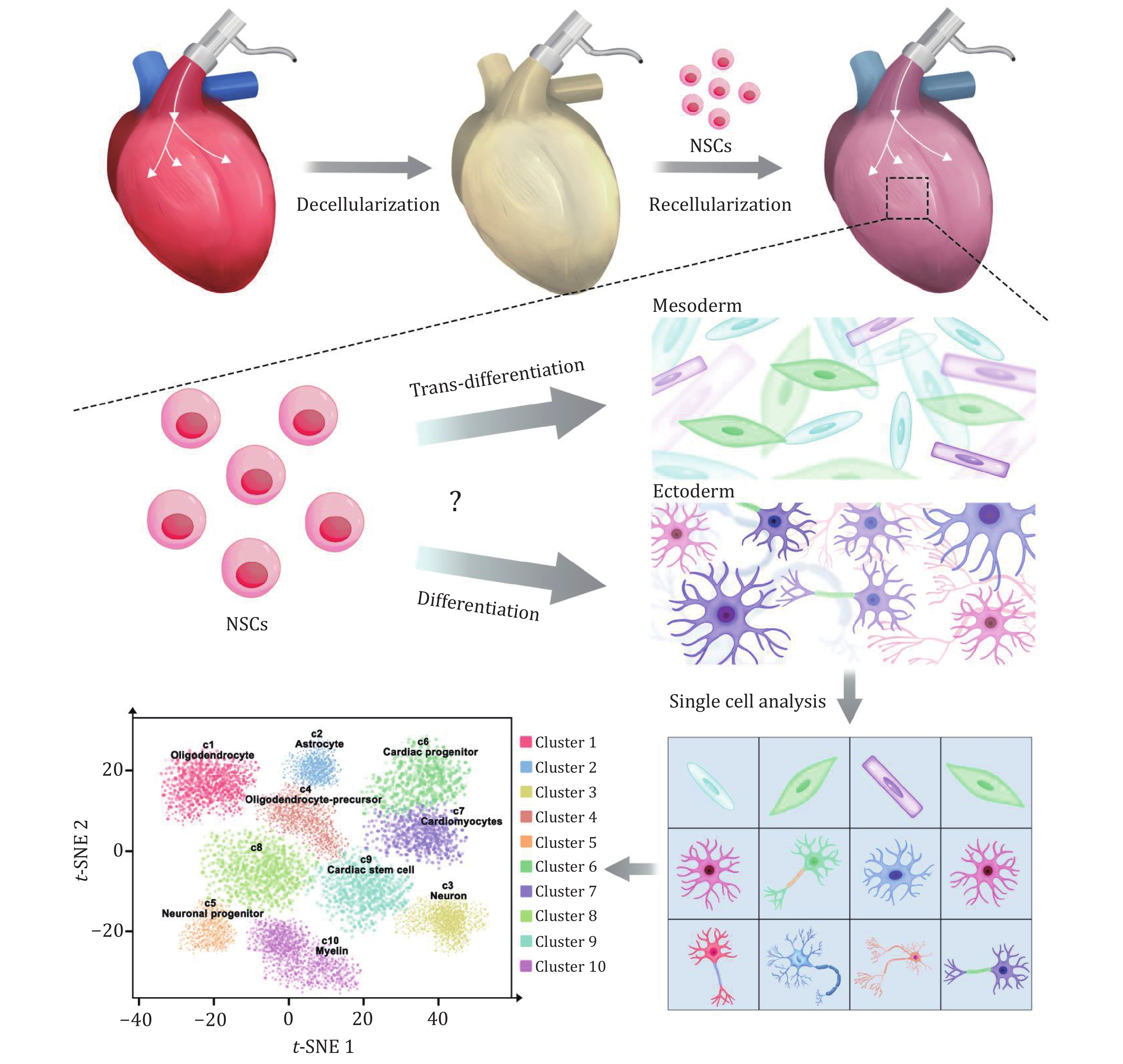 The whole heart decellularized extracellular matrix (ECM) has become a promising scaffold material for cardiac tissue engineering. Our previous research has shown that the whole heart acellular matrix possesses the memory function regulating neural stem cells (NSCs) trans-differentiating to cardiac lineage cells. However, the cell subpopulations and phenotypes in the trans-differentiation of NSCs have not been clearly identified. Here, we performed single-cell RNA sequencing and identified 2,765 cells in the recellularized heart with NSCs revealing the cellular diversity of cardiac and neural lineage, confirming NSCs were capable of trans-differentiating into the cardiac lineage while maintaining the original ability to differentiate into the neural lineage. Notably, the trans-differentiated heart-like cells have dual signatures of neuroectoderm and cardiac mesoderm. This study unveils an in-depth mechanism underlying the trans-differentiation of NSCs and provides a new opportunity and theoretical basis for cardiac regeneration.