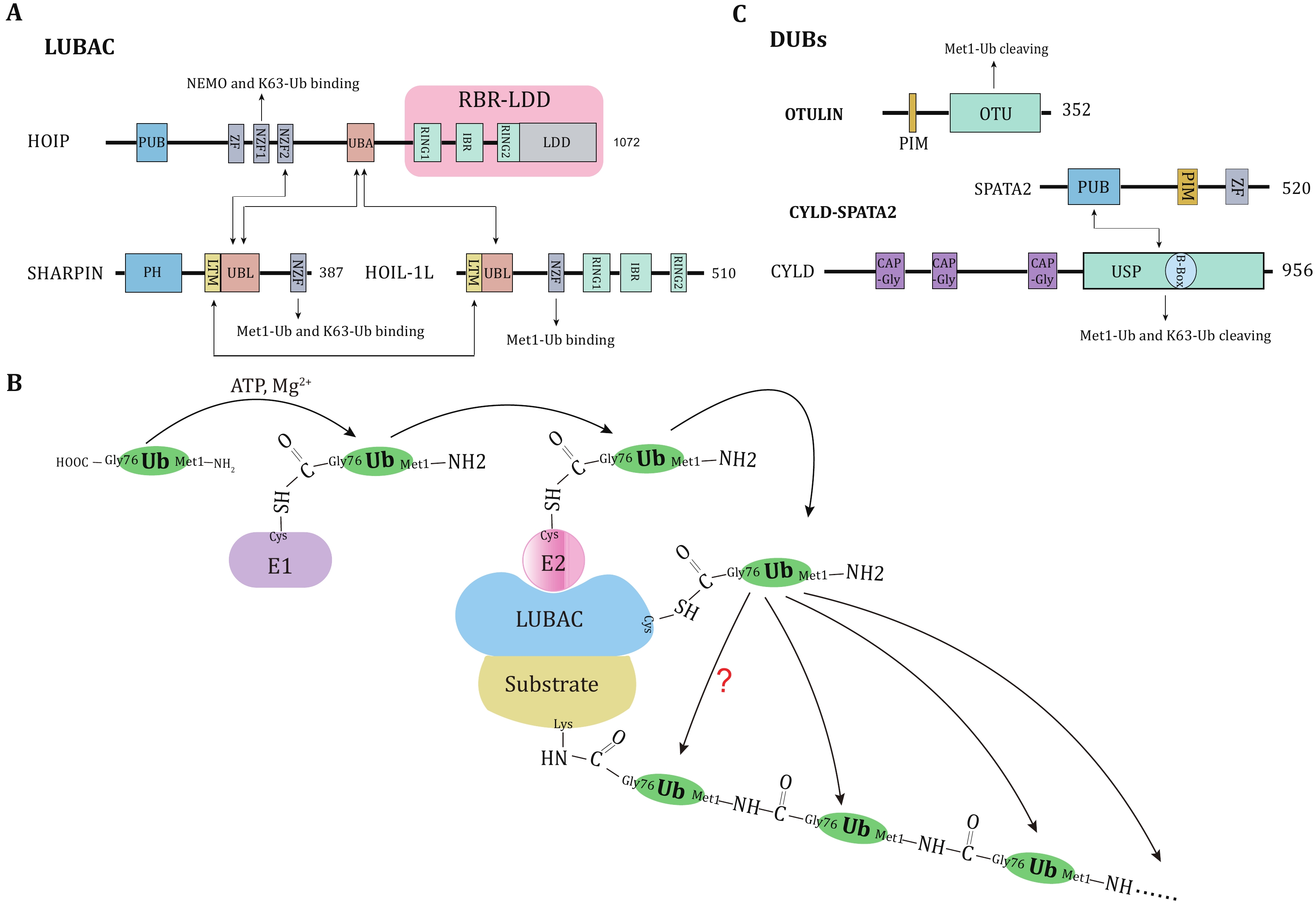 Met1-linked ubiquitination (Met1-Ub), also known as linear ubiquitination, is a newly identified atypical type of polyubiquitination that is assembled via the N-terminal methionine (Met1) rather than an internal lysine (Lys) residue of ubiquitin. The linear ubiquitin chain assembly complex (LUBAC) composed of HOIP, HOIL-1L and SHARPIN is the sole E3 ubiquitin ligase that specifically generates Met1-linked ubiquitin chains. The physiological role of LUBAC-mediated Met1-Ub has been first described as activating NF-κB signaling through the Met1-Ub modification of NEMO. However, accumulating evidence shows that Met1-Ub is broadly involved in other cellular pathways including MAPK, Wnt/β-Catenin, PI3K/AKT and interferon signaling, and participates in various cellular processes including angiogenesis, protein quality control and autophagy, suggesting that Met1-Ub harbors a potent signaling capacity. Here, we review the formation and cellular functions of Met1-linked ubiquitin chains, with an emphasis on the recent advances in the cellular mechanisms by which Met1-Ub controls signaling transduction.
