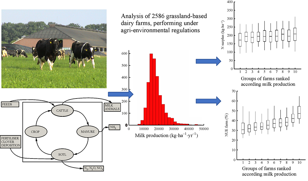 Many grassland-based dairy farms are intensifying production, i.e., produce more milk per ha of land in response to the increasing demand for milk (by about 2% per year) in a globalized market. However, intensive dairy farming has been implicated for its resources use, ammonia and greenhouse gas emissions, and eutrophication impacts. This paper addresses the question of how the intensity of dairy production relates to N and P surpluses and use efficiencies on farms subjected to agri-environmental regulations. Detailed monitoring data were analyzed from 2858 grassland-based dairy farms in The Netherlands for the year 2015. The farms produced on average 925 Mg·yr−1 milk. Milk production per ha ranged from<10 to>30 Mg·ha−1·yr−1. Purchased feed and manure export strongly increased with the level of intensification. Surpluses of N and P at farm level remained constant and ammonia emissions per kg milk decreased with the level of intensification. In conclusion, N and P surpluses did not differ much among dairy farms greatly differing in intensity due to legal N and P application limits and obligatory export of manure surpluses to other farms. Further, N and P use efficiencies also did not differ among dairy farms differing in intensity provided the externalization of feed production was accounted for. This paper provides lessons for proper monitoring and control of N and P cycling in dairy farming.