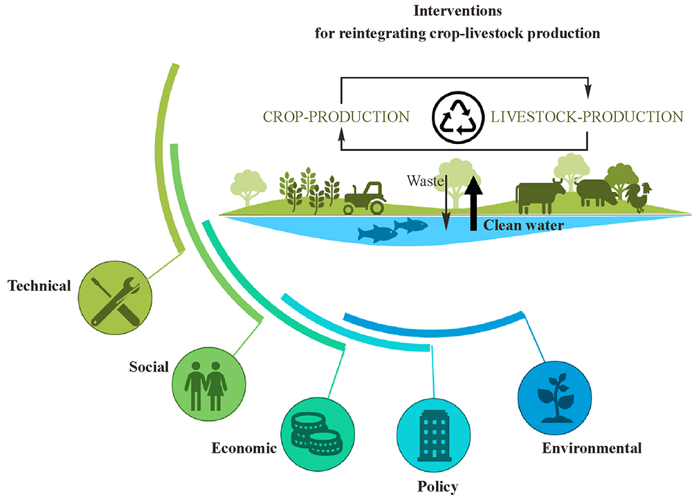 Crop and livestock production are essential to maintain food security. In China, crop and livestock production were integrated in the past. Today, small backyard systems are still integrated but the larger livestock farms are landless and largely geographically separated from crop production systems. As a result, there is less recycling of animal manures and there are lower nutrient use efficiencies in the Chinese food production systems. This, in turn, results in considerable losses of nutrients, causing water pollution and harmful algal blooms in Chinese lakes, rivers and seas. To turn the tide, there is a need for agricultural “green” development for food production through reintegrating crop and livestock production. An additional wish is to turn the Chinese water systems “blue” to secure clean water for current and future generations. In this paper, current knowledge is summarized to identify promising interventions for reintegrating crop and livestock production toward clean water. Technical, social, economic, policy and environmental interventions are addressed and examples are given. The paper highlights recommended next steps to achieve “green” agriculture and “blue” water in China.