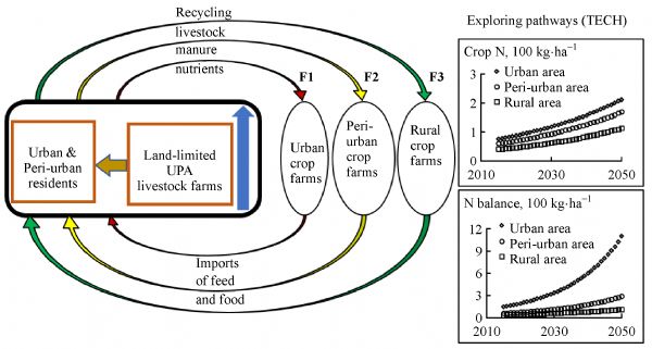 Livestock manures were the main organic wastes in urban areas, although only 20 to 40% of animal-sourced food consumed was produced in UPA, and only 14 to 19% of protein intake by residents was animal-based. Scenarios indicate that manure production in UPA will increase 3 to 10 times between 2015 and 2050, depending on urbanization and UPA intensification. Only 13 to 38% of manure N will be recycled in croplands. Farm-gate N balances of UPA livestock farms will increase to>1 t·ha−1 in 2050. Doubling livestock productivity and feed protein conversion to animal-sourced food will roughly halve manure N production.