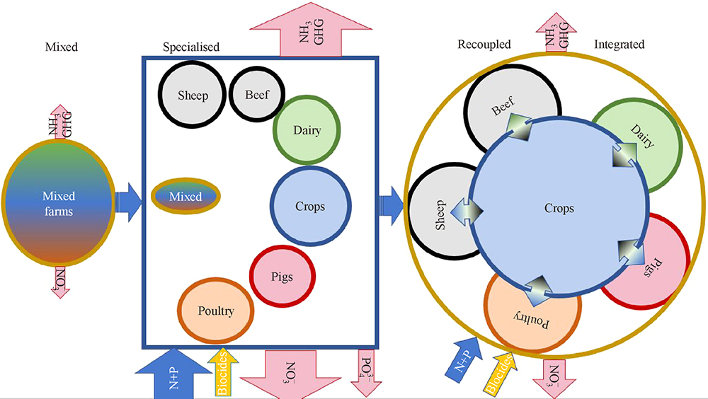 Ongoing specialization of crop and livestock systems provides socioeconomic benefits to the farmer but has led to greater externalization of environmental costs when compared to mixed farming systems. Better integration of crop and livestock systems offers great potential to rebalance the economic and environmental trade-offs in both systems. The aims of this study were to analyze changes in farm structure and review and evaluate the potential for reintegrating specialized intensive crop and livestock systems, with specific emphasis on identifying the co-benefits and barriers to reintegration. Historically, animals were essential to recycle nutrients in the farming system but this became less important with the availability of synthetic fertilisers. Although mixed farm systems can be economically attractive, benefits of scale combined with socio-economic factors have resulted in on-farm and regional specialization with negative environmental impacts. Reintegration is therefore needed to reduce nutrient surpluses at farm, regional and national levels, and to improve soil quality in intensive cropping systems. Reintegration offers practical and cost-effective options to widen crop rotations and promotes the use of organic inputs and associated benefits, reducing dependency on synthetic fertilisers, biocides and manure processing costs. Circular agriculture goes beyond manure management and requires adaptation of both food production and consumption patterns, matching local capacity to produce with food demand. Consequently, feed transport, greenhouse gas emissions, nutrient surpluses and nutrient losses to the environment can be reduced. It is concluded that reintegration of specialized farms within a region can provide benefits to farmers but may also lead to further intensification of land use. New approaches within a food system context offer alternatives for reintegration, but require strong policy incentives which show clear, tangible and lasting benefits for farmers, the environment and the wider community.