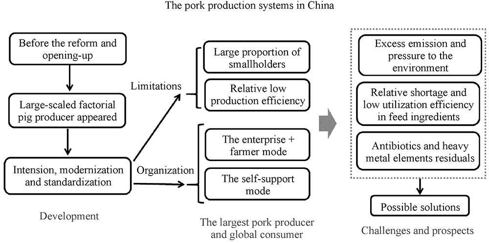 This paper reviews the changes in pork production in China, the largest pork producing and consuming nation in the world. The pork sector in China has changed dramatically since the 1990s, with large-scale intensive pork production systems replacing the former, exclusively family-based pork production systems. Modern breeding, feeding, vaccinating, and management technologies are widely used now. However, smallholders still account for a large proportion of the total production. The intensification and specialization of the pork sector is expected to continue in the future, but there is increasing awareness and pressure to develop more environmentally-sustainable production systems. The relative shortage of domestically produced feed, the low utilization efficiency of feed ingredients, the large emissions of nitrogen and phosphorus to the environment, the high use of antibiotics, and the presence of residual metals in manures are very large challenges for the pork sector nowadays. To solve these problems, techniques including new feed resource utilization, precise feeding, low-protein diets, alternatives to antibiotics and increased manure recycling are all important topics and research directions today. With new techniques and management approaches, it is possible to build more sustainable pork production systems in China.