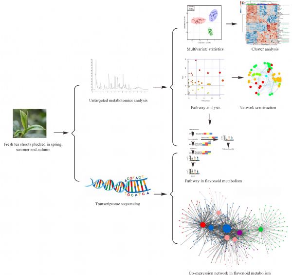 Metabolites, especially secondary metabolites, are very important in the adaption of tea plants and the quality of tea products. Here, we focus on the seasonal variation in metabolites of fresh tea shoots and their regulatory mechanism at the transcriptional level. The metabolic profiles of fresh tea shoots of 10 tea accessions collected in spring, summer, and autumn were analyzed using ultra-performance liquid chromatography coupled with quadrupole-obitrap mass spectrometry. We focused on the metabolites and key genes in the phenylpropanoid/flavonoid pathway integrated with transcriptome analysis. Multivariate statistical analysis indicates that metabolites were distinctly different with seasonal alternation. Flavonoids, amino acids, organic acids and alkaloids were the predominant metabolites. Levels of most key genes and downstream compounds in the flavonoid pathway were lowest in spring but the catechin quality index was highest in spring. The regulatory pathway was explored by constructing a metabolite correlation network and a weighted gene co-expression network.