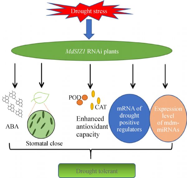 Drought stress typically causes heavy losses in apple production and uncovering the mechanisms by which apple tolerates drought stress is important in apple breeding. MdSIZ1 is a SUMO (small ubiquitin-like modifier) E3 ligase that promotes SUMO binding to substrate proteins. Here, we demonstrate that MdSIZ1 in apple has a negative relationship with drought tolerance. MdSIZ1 RNAi transgenic apple trees had a higher survival rate after drought stress. During drought stress they had higher leaf water potential, reduced ion leakage, lower H2O2 and malondialdehyde contents, and higher catalase activity. In addition, MdSIZ1 RNAi transgenic plants had a higher net photosynthetic rate during the latter period of drought stress. Finally, the transgenic apple trees also altered expression levels of some microRNAs in response to drought stress. Taken together, these results indicate that apple MdSIZ1 negatively regulates drought stress by enhancing leaf water-holding capacity and antioxidant enzyme activity.
