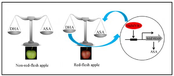 Ascorbic acid (AsA, vitamin C) is involved in the regulation of many aspects of plant growth and development. It is an essential micronutrient for humans and can prevent scurvy, maintain the health of gums and blood vessels, reduce the level of plasma cholesterol and enhance the immune systen. Apple cultivars Orin and Guanghui were crossed to obtain a group of hybrid offspring with and without red flesh in the course of assessing apple germplasm resources. Unexpectedly, the red-flesh apples had higher AsA contents than other apples. Further studies showed that the anthocyanin biosynthetic regulator MdMYB1 directly activates the expression of dehydroascorbate reductase gene MdDHAR, thus promoting the activity of the DHAR enzyme and the accumulation of AsA. This finding reveals the mechanism leading to high AsA levels in red-flesh apples and suggests a new idea to cultivate red-flesh apples with high AsA contents and produce AsA efficiently and without pollution.