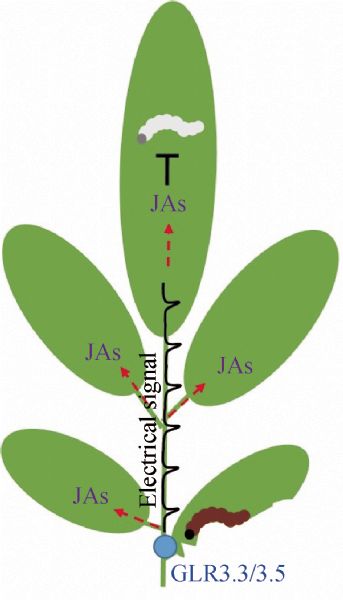 Electrical signals commonly occur in plants in response to various environmental changes and have a dominant function in plant acclimation. The transduction of wound-elicited electrical signals in the model plant species Arabidopsis has been characterized but the characteristics of electrical signal transduction in response to herbivory or wounding in crop species remain unknown. Here, the features of electrical signals elicited by insect herbivory and wounding in tomato were investigated. Unlike those in Arabidopsis, wounding tomato leaves did not cause leaf-to-leaf electrical signal transduction. In contrast, electrical signals elicited in response to petiole wounding were stronger and more strongly transduced. Leaflet wounding also activated electrical signal transduction and jasmonic acid (JA) signaling within the whole compound leaf. It was also demonstrated that tomato glutamate receptor-like 3.3 (GLR3.3) and GLR3.5 mediated leaflet-to-leaflet electrical signal transduction. Herbivory-induced JA accumulation and Helicoverpa armigera resistance were reduced in glr3.3/3.5 plants. This work reveals the nature of electrical signal transduction in tomato and emphasizes the key roles of GLR3.3 and GLR3.5 in electrical signal transduction and JA signaling activation.