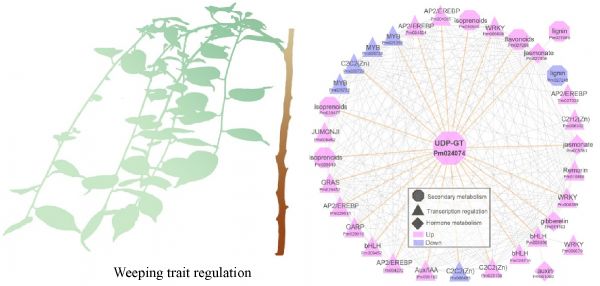 Download cover Download PDFs• Five QTLs associated with weeping traits on chromosome 7 were identified by BSR-seq. • The novel allele PmUGT72B3 has a synonymous transition of T66 (upright) to C (weeping) in the coding sequence and a 470-bp deletion in the promoter region. • PmUGT72B3 was associated with hormone and lignin regulation by WGCNA.