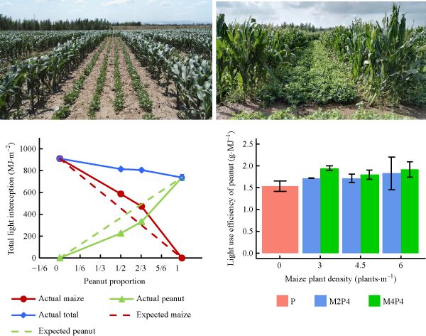 Intercropping increases crop yields by optimizing light interception and/or use efficiency. Although intercropping combinations and metrics have been reported, the effects of plant density on light use are not well documented. Here, we examined the light interception and use efficiency in maize-peanut intercropping with different maize plant densities in two row configurations in semiarid dryland agriculture over a two-year period. The field experiment comprised four cropping systems, i.e. monocropped maize, monocropped peanut, maize-peanut intercropping with two rows of maize and four rows of peanut, intercropping with four rows of maize and four rows of peanut, and three maize plant densities (3.0, 4.5 and 6.0 plants m−1 row) in both monocropped and intercropping maize. The mean total light interception in intercropping across years and densities was 779 MJ·m−2, 5.5% higher than in monocropped peanut (737 MJ·m−2) and 7.6% lower than in monocropped maize (843 MJ·m−2). Increasing maize density increased light interception in monocropped maize but did not affect the total light interception in the intercrops. Across years the LUE of maize was 2.9 g·MJ−1 and was not affected by cropping system but increased with maize plant density. The LUE of peanut was enhanced in intercropping, especially in a wetter year. The yield advantage of maize-peanut intercropping resulted mainly from the LUE of peanut. These results will help to optimize agronomic management and system design and provide evidence for system level light use efficiency in intercropping.