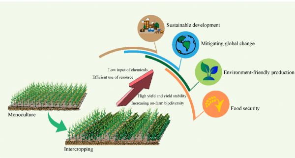 Intercropping is a traditional farming system that increases crop diversity to strengthen agroecosystem functions while decreasing chemical inputs and minimizing negative environmental effects of crop production. Intercropping is currently considerable interest because of its importance in sustainable agriculture. Here, we synthesize the factors that make intercropping a sustainable means of food production by integrating biodiversity of natural ecosystems and crop diversity. In addition to well-known yield increases, intercropping can also increase yield stability over the long term and increase systemic resistance to plant diseases, pests and other unfavorable factors (e.g. nutrient deficiencies). The efficient use of resources can save mineral fertilizer inputs, reduce environmental pollution risks and greenhouse gas emissions caused by agriculture, thus mitigating global climate change. Intercropping potentially increases above- and below-ground biodiversity of various taxa at field scale, consequently it enhances ecosystem services. Complementarity and selection effects allow a better understanding the mechanisms behind enhanced ecosystem functioning. The development of mechanization is essential for large-scale application of intercropping. Agroecosystem multifunctionality and soil health should be priority topics in future research on intercropping.