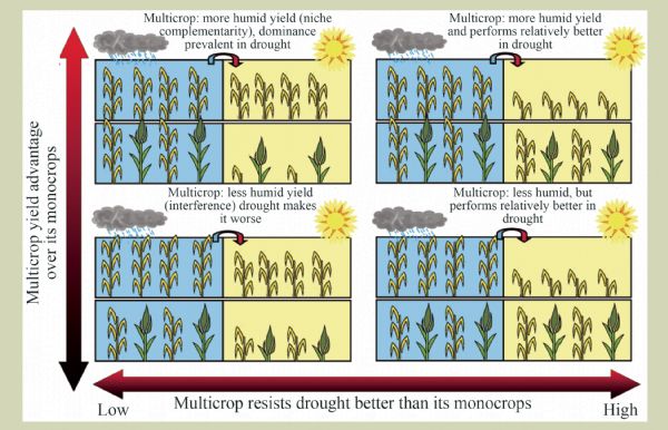 ● A framework for multicrop advantage under varying watering conditions is provided. ● This framework clarifies the relation between multicrop overyielding and land use efficiency. ● A novel experimental setup was used to evaluate these theoretical developments. ● Theory and experiment conveyed precise understanding of overyielding scenarios.