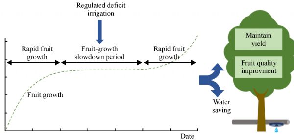 • Regulated deficit irrigation was assessed in almond, peach and plum over 3 years. • Fruit-growth slowdown stages are appropriate periods to apply deficit irrigation. • Peach yields were unaffected under a regulated deficit irrigation of 75% ETC. • Regulated deficit irrigation of 50% ETC maintained yields of almond and plum. • Fruit quality improved under regulated deficit irrigation.