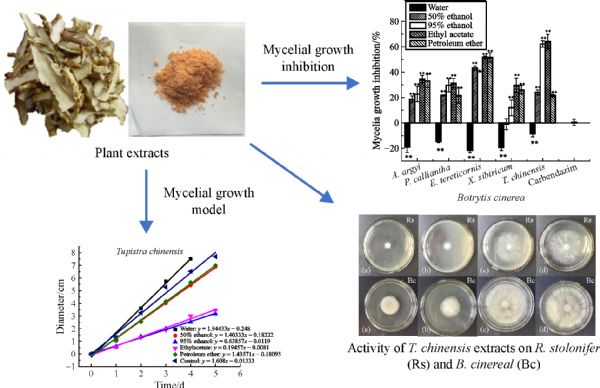 • Ethyl acetate and 95% ethanol extracts from T. chinensis rhizomes gave great inhibition on six plant pathogenic fungi • T. chinensis has potential to be a new natural fungicide resource • T. chinensis has potential to be used for the preservation of agricultural and forestry products such as fruits and vegetables