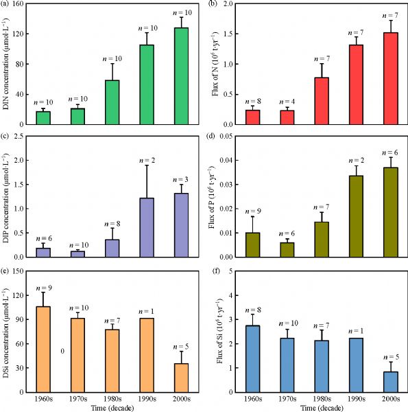 Intensifying human activity in the Yangtze River basin has substantially increased nutrient concentrations in the Yangtze River Estuary, leading to degradation of the coastal environment. Analysis of nutrient determinations published over the past 50 years reveals a gradual decreasing trend in the concentrations and fluxes of dissolved silicate (DSi). However, both dissolved inorganic nitrogen (DIN) and dissolved inorganic phosphate (DIP) concentrations have increased significantly since the 1970s. The frequency of and area covered by red tide outbreaks have increased greatly during this period, mainly due to changes in nutrient supply ratios [i.e., N/P (DIN/DIP), N/Si (DIN/DSi), P/Si (DIP/DSi)]. A strong correlation was found between the riverine DIN fluxes and the estimated DIN inputs from the major N sources, particularly fertilizers and atmospheric deposition. The data provide a comprehensive assessment of nutrients in the Yangtze River basin and their ecological impacts and indicate a potentially significant influence of atmospheric deposition on DIN loadings and fluxes.