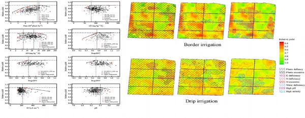 • A relative yield of 70% was obtained under both border and drip irrigation. • Drip irrigation saved water and lowered yield variability compared to border irrigation. • Drip irrigation led to accumulation of soil nitrogen and phosphorus in the root zone. • Relative yield may increase 8% to 10% by optimizing field management. • Plant density, irrigation and nitrogen are major factors closing yield gap in NW China.
