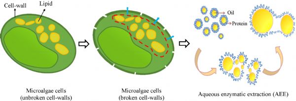 • Aqueous enzymatic extraction (AEE) is performed for oil extraction from Schizochytrium sp. • AEE process is optimized by response surface methodology. • Microalgal oil extracted by AEE has high contents of PUFA, tocopherols and phenolics. • AEEO exhibits considerable antioxidant activity as compared with SEO.