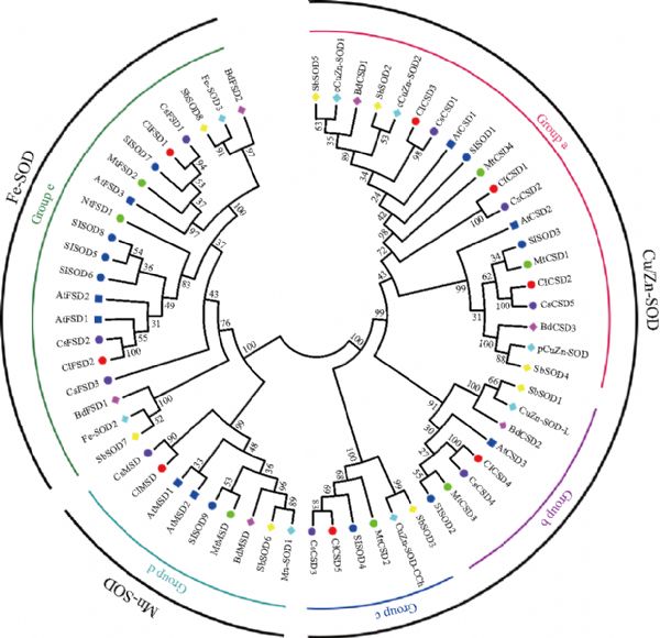• A total of 8 SOD genes from watermelon were identified and bioinformatically analyzed. • The SOD proteins from watermelon and other different plant species can be classified into five groups consistent with their metal cofactors. • ClSOD genes exhibited distinctive tissue-specific and abiotic stress responsive expression patterns.