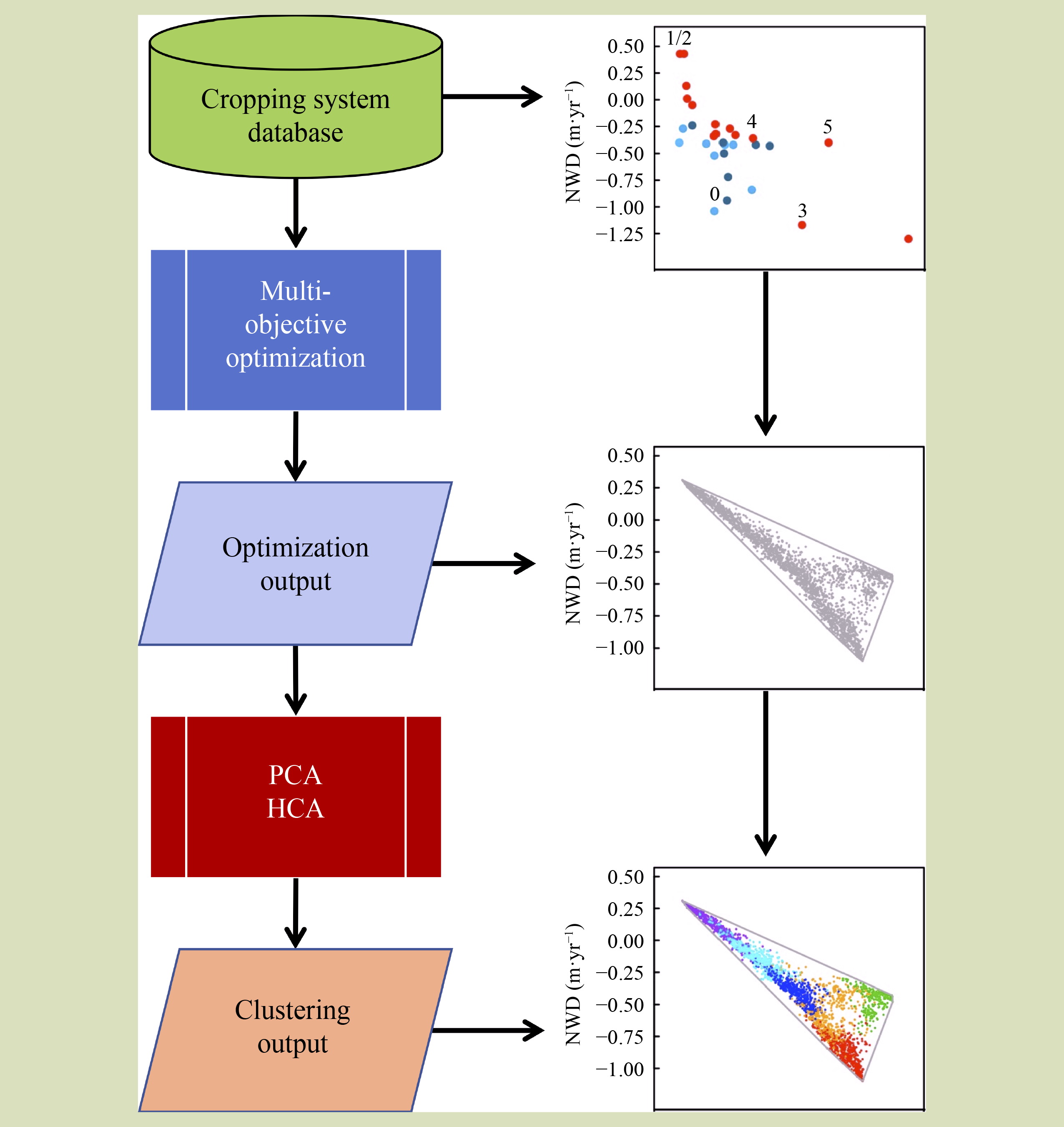 Since the Green Revolution cropping systems have been progressively homogenized and intensified with increasing rates of inputs such as fertilizers, pesticides and water. This has resulted in higher crop productivity but also a high environmental burden due to increased pollution and water depletion. To identify opportunities for increasing the productivity and reducing the environmental impact of cropping systems, it is crucial to assess the associated trade-offs. The paper presents a model-based analysis of how 30 different crop rotations practiced in the North China Plain could be combined at the regional level to overcome trade-offs between indicators of economic, food security, and environmental performance. The model uses evolutionary multi-objective optimization to maximize revenues, livestock products, dietary and vitamin C yield, and to minimize the decline of the groundwater table. The modeling revealed substantial trade-offs between objectives of maximizing productivity and profitability versus minimizing ground water decline, and between production of livestock products and vitamin C yield. Six strategies each defining a specific combination of cropping systems and contributing to different extents to the various objectives were identified. Implementation of these six strategies could be used to find opportunities to mitigate the trade-offs between objectives. It was concluded that a holistic analysis of the potential of a diversity cropping systems at a regional level is needed to find integrative solutions for challenges due to conflicting objectives for food production, economic viability and environmental protection.