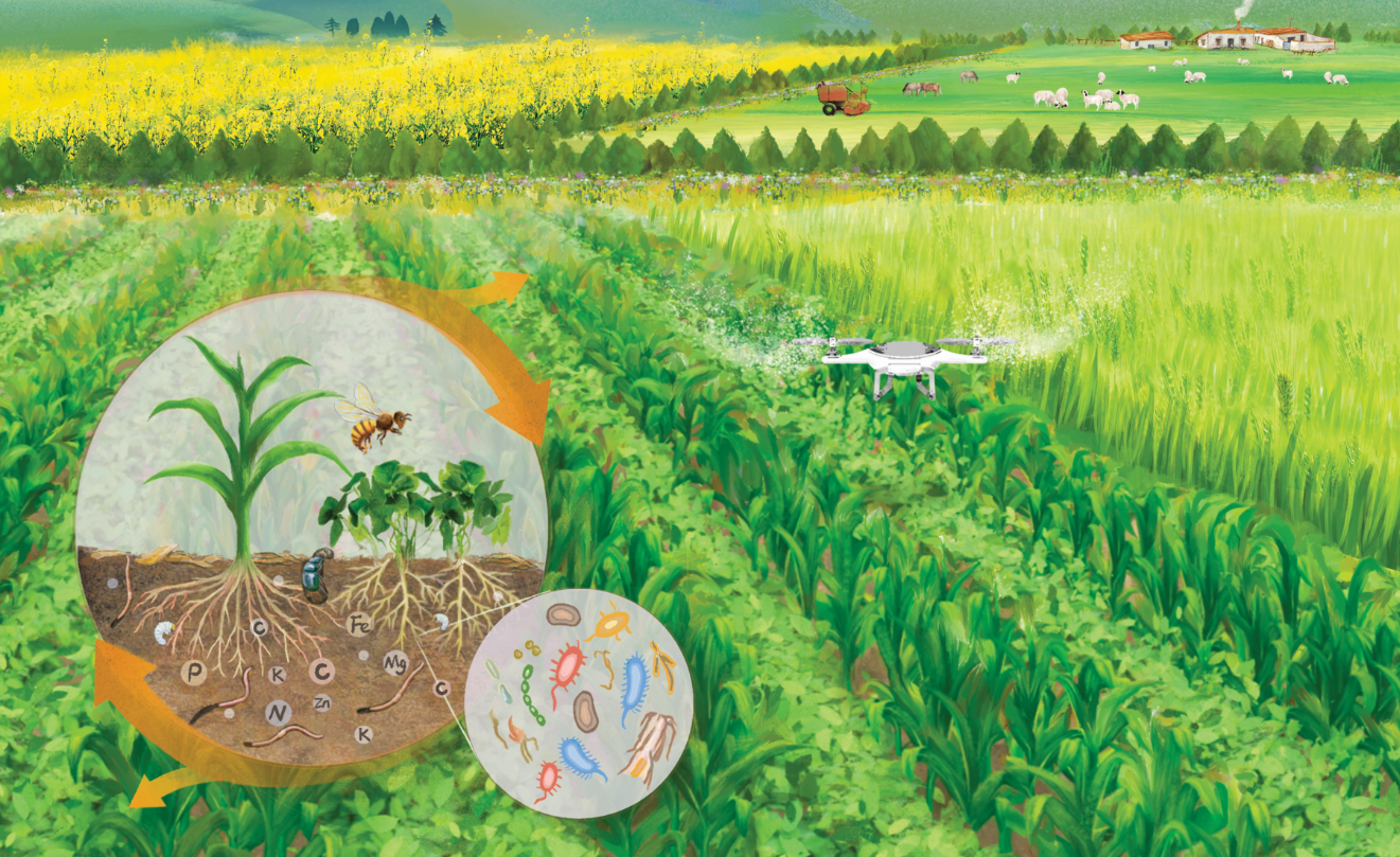 The cover picture exhibits a vision of future sustainable crop and pasture systems in North China Plain in early May. Winter wheat is under grain filling stage, spring maize at the elongation stage and spring soybean at the branching stage are grown as intercrops. At a distance, oilseed rape is at the end of flowering stage, and pasture is just after spring cut by grass harvester. Such cropping systems are charaterized by two key features: (1) crop diversification with intercropping and crop rotation at the field scale, and hedges and flower strips at the landscap [Detail] ...
