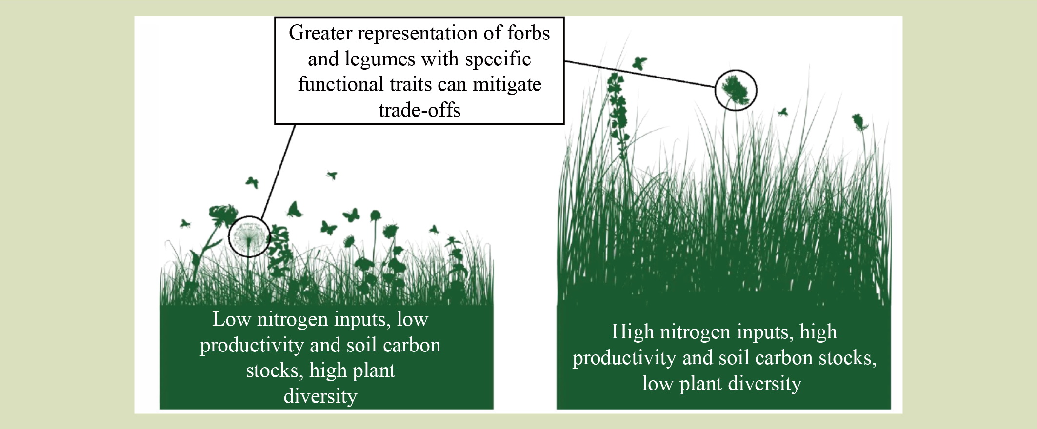 ● Data from the Park Grass Experiment shows inherent trade-offs between species richness, biomass production and soil organic carbon. ● Soil organic carbon is positively correlated with biomass production that increases with fertilizer additions. ● Variance in outcomes can be understood in terms of the dominant ecological strategies of the plant communities indicated by functional traits. ● There was an indication that data on traits associated with the spatiotemporal pattern of resource capture could be used to design species mixtures with greater resource use complementarity, increasing species richness without sacrificing productivity. ● Variance in soil organic carbon was positively correlated with pH.