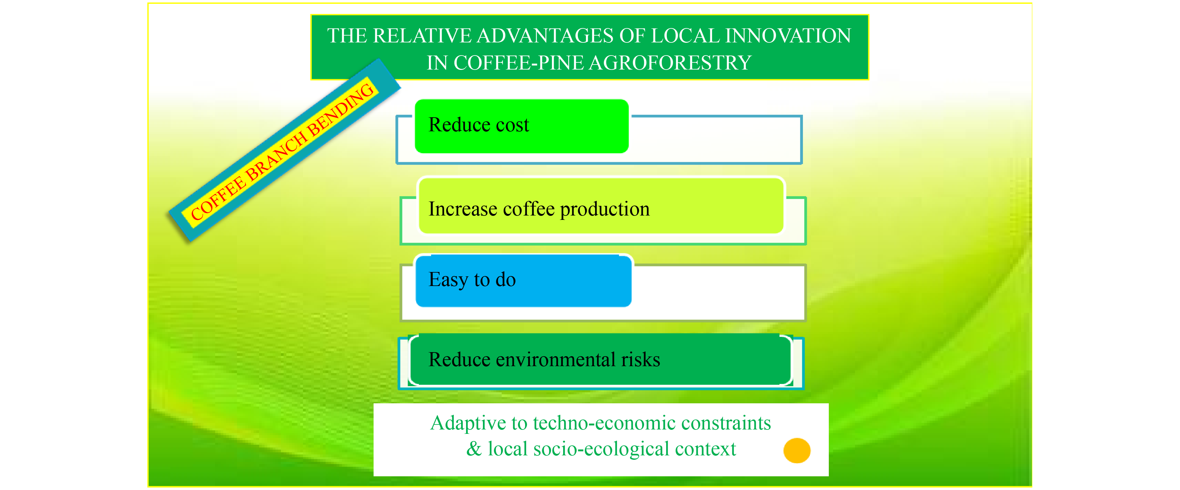 ● Promotion of local sustainable innovation developed by forest farmers. ● Focusing on bending of branches to increase coffee production in a pine-based agroforestry system. ● Using a combination of concepts of perceived characteristics of innovation. ● Techno-social, economic and ecological benefits are the key features. ● Local techniques may be prospective for developing sustainable agroforestry innovation.