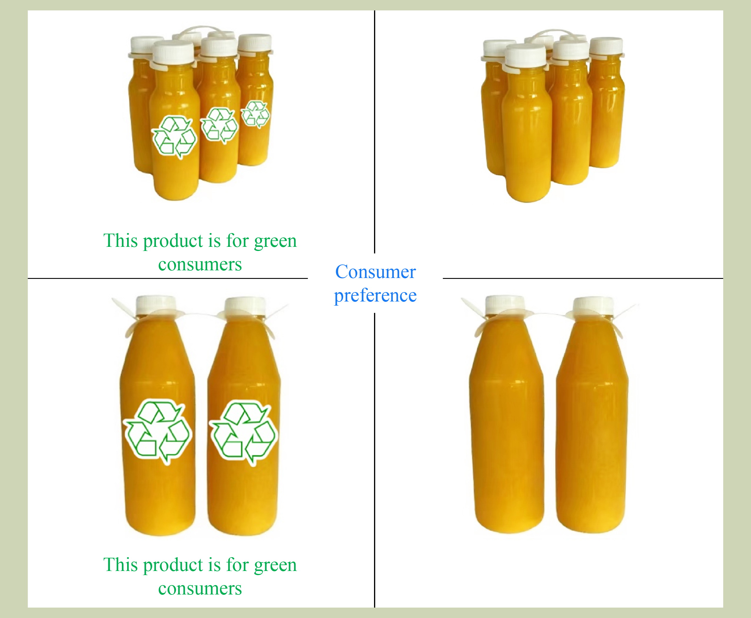 ● Consumer preference for environmentally-friendly beverage packaging was investigated. ● Consumers are willing to pay a premium for post-consumer recycled materials. ● Environmental information and green identity labels have synergistic effect on consumer willingness to pay. ● Product unit size seems irrelevant in most consumer decisions.