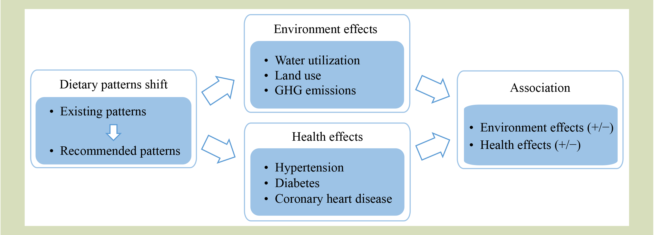With the rapid development of China’s economy, Chinese people tend to eat foods rich in fat, sugar and protein. This change in dietary pattern has brought double challenges to China’s sustainable development of environment and human health. So it has become urgent for the nation to shift to a healthy and sustainable dietary pattern. Based on the China Health and Nutrition Survey database, this study used K-means cluster analysis to classify China’s existing dietary patterns into quasi-southern, quasi-northern and quasi-western patterns. Two alternative recommended dietary patterns, Chinese dietary and planet health patterns, were selected to compare the effects of environment and health. The results show that a shift from the three existing dietary patterns to two alternative dietary patterns could enhance sustainable development of environment, especially for the quasi-western pattern shifting to the planet health pattern. Also, a shift would have of great benefits for human health, effectively reduce the relative risks of diseases such as hypertension, type 2 diabetes and coronary heart disease. The greatest benefits would come from shifting the quasi-western pattern benefits to one of the two alternative dietary patterns in terms of environment effects, and the quasi-southern pattern benefits most in terms of health effects. Shifting to the planet health pattern is more effective than the Chinese dietary pattern both in environment and human health. This paper provides policy recommendations to vigorously advocate dietary balance, scientifically promote dietary patterns, and change consumer dietary behavior.