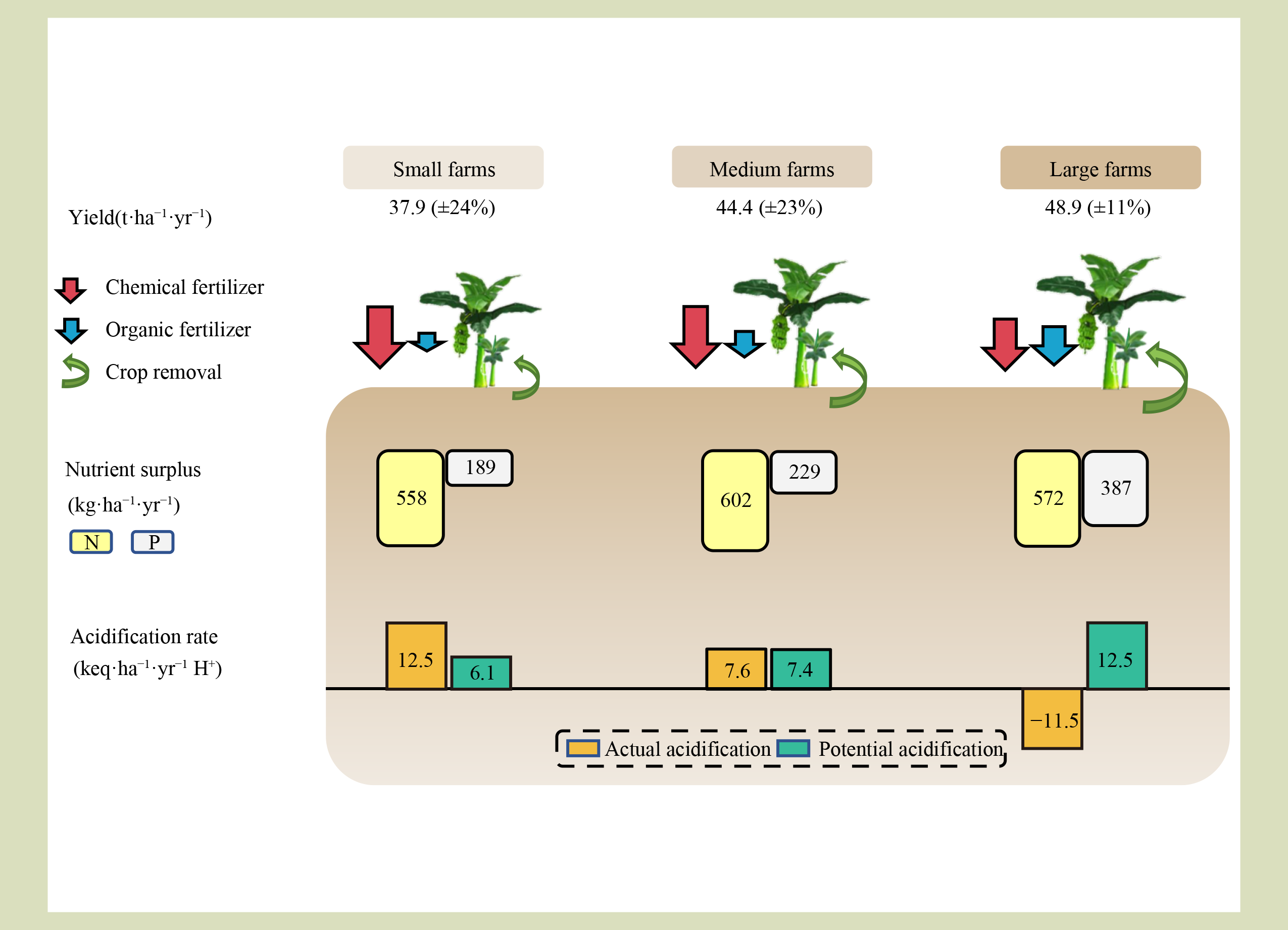 Large-scale farming by agricultural land transfers has been increasingly promoted in recent years, but the possible impacts on crop production, especially cash crops, and soil acidification remain unclear. This study obtained data for 110 banana plantations in Long’an County, China, and categorized them into small (< 0.67 ha), medium (0.67−6.7 ha), and large (> 6.7 ha) to determine banana cultivation, nutrient management, and soil acidification rates on farms of the three sizes. Banana yield per unit area significantly increased with increased farm size, and large farms had the highest average yield (48.9 t·ha−1) with the least variation. Despite a significant increase in organic fertilizer and base cation inputs, nitrogen (N) surplus did not differ significantly with increasing farm size. With large farms, actual soil acidification rate was significantly lower by 19.1 to 24.0 keq·ha−1·yr−1; however, potential soil acidification rate increased with increased overuse of phosphorus. Overall, larger banana plantations used fewer mineral N fertilizers reducing the rate of soil acidification and increasing the H+ buffering provided by organic fertilizers. It is concluded that larger farms deliver the dual benefits of higher, less variable banana yield and mitigation of soil acidification by substituting organic N for mineral N fertilizers, supporting sustainable soil management and food production.