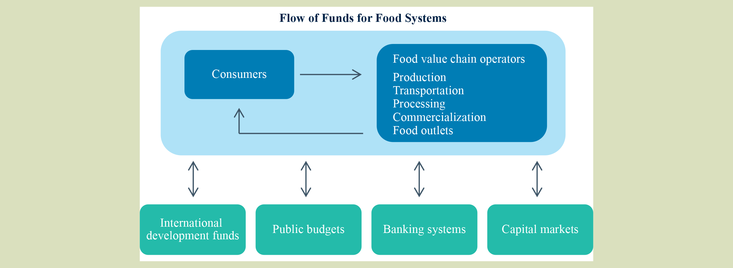 ● The analysis of financing for the transformation of food systems requires first a consideration of costs. ● Costs are then compared to six main financial flows, two internal and four external to food systems. ● There are enough potential financial resources available to fund the transformation of food systems. ● To mobilize the existing and potential funds adequate macroeconomic and overall incentive frameworks are needed, plus a variety of specific interventions discussed in the paper. ● Developing countries need to establish national structures to design, finance and coordinate comprehensive national programs for their food systems.
