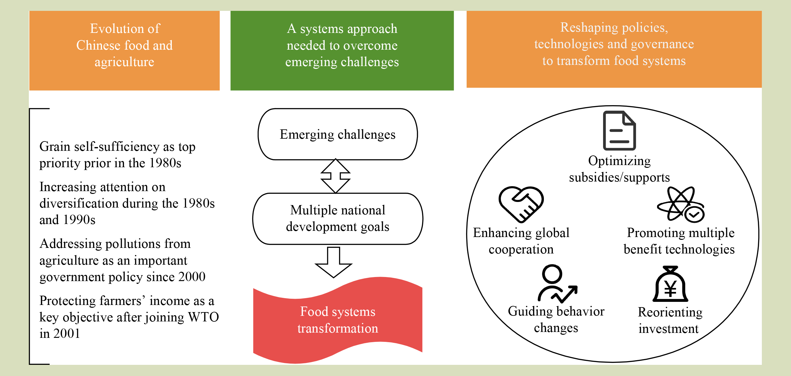After decades of development, China has made significant progress in ensuring national food security. However, the country currently faces multiple challenges, including the double burden of malnutrition, i.e., micronutrient deficiencies and overweight/obesity, climate change, resource stress and environmental degradation, and an increasingly complex global market. This paper reviews past developments in food and agriculture, and offers initial insights into transforming the Chinese food system for achieving multiple national development goals using a systems approach. Strategies and solutions from China can also inform the design and implementation of food system transformation in other emerging economies.