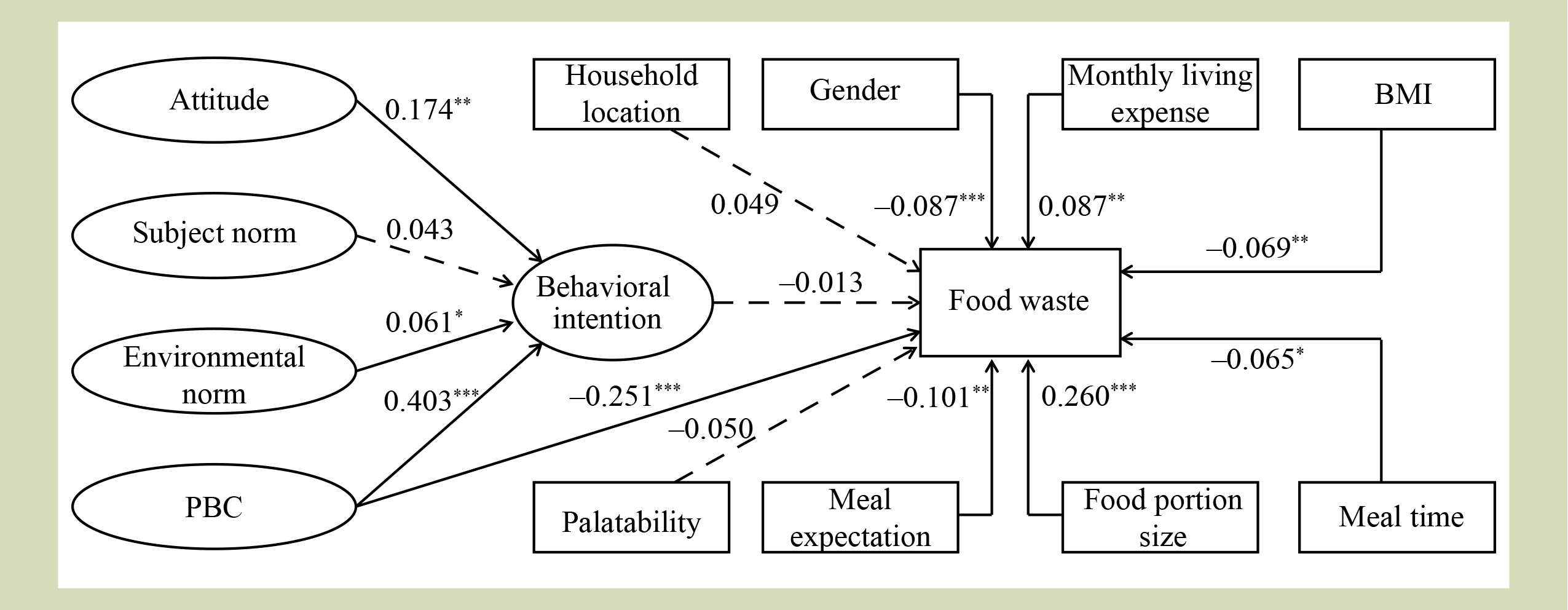 ● Investigate the actual situation of food waste at university canteens in Beijing, China. ● Analyze the influential factors of student food-waste behavior in university canteens. ● Construct the theoretical model of the factors influencing food waste behavior based on the theory of planned behavior. ● Measure the path coefficients of psychological factors, individual characteristics, and dining factors to food waste behavior. ● Suggest some measures to reduce and prevent food waste at university canteens.
