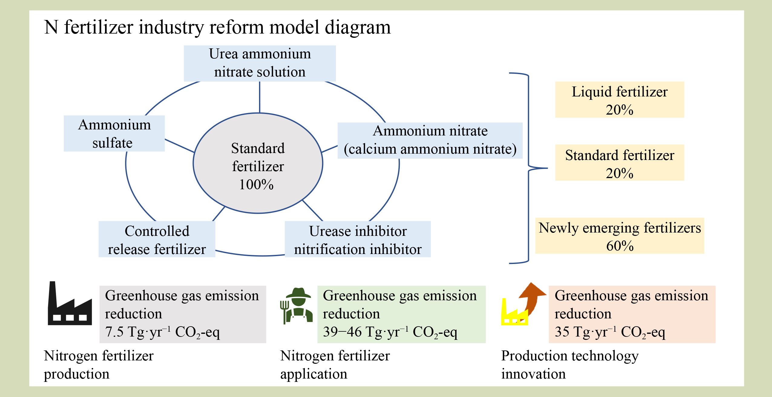 Globally, the reduction of excessive N losses and greenhouse gas (GHG) emissions is a central environmental challenge in the 21 century. China has huge associated emissions during both production and land application phases. In addition, 70% of N fertilizer in China is produced and land applied as urea, which has high associated emissions. This study utilized life cycle analysis to compare the carbon emission capacity of different N fertilizers and quantified GHG emissions from different N fertilizer chains within China. This enabled a new innovative reform model to be proposed, which aims to decrease the carbon footprint and increase the net ecosystem carbon budget of China. The results showed that the carbon footprint of the N fertilizer industry was about 229 Tg·yr−1 CO2-eq in 2020. Through changes away from urea through the production and land application of a mix of newly emerging fertilizers, liquid fertilizers and standard fertilizer reductions to 174–182 Tg·yr−1 CO2-eq. Through the upgrading of mineral N fertilizer production technology, the carbon footprint of N fertilizer chain can be reduced by 34.8 Tg·yr−1 CO2-eq. Such reductions would reduce China’s total GHG emissions to 140–147 Tg·yr−1 CO2-eq.