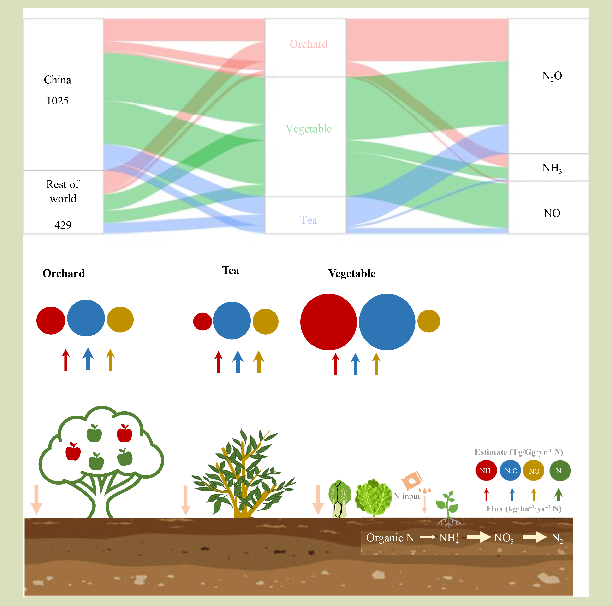 Nitrogen fertilizer application has accelerated the agricultural soil N cycle while ensuring food security. Gaseous reactive N emissions from orchards, vegetables and tea plantations (OVT) are less understood than those from cereal crops. This paper presents a compilation of data on soil ammonia, nitrous oxide, and nitric oxide emissions from 1454 OVT systems at 184 unique experimental locations worldwide aiming to investigate their emission characteristics, emission factors (EF), and contribution to total farmland emissions. NH3 and N2O emissions from orchards and N2O and NO emissions from vegetable production were significantly higher in China than in the rest of the world, regardless of fertilizer application, while N2O emissions from tea plantations were lower than for vegetables. The EF of NH3 for vegetables was close to the global mean value with urea application but significantly higher than that of orchards. The EF of N2O in orchards and vegetables was comparable to the global median value, while in tea plantations, the value was 2.3 times higher than the global median value. Current estimates suggest that direct emissions of NH3, N2O, and NO from OVT systems are equivalent to approximately a quarter, two thirds and a half of the total farmland in China, respectively. Future research needs to strengthen observational field studies in establishing standard sampling methods for gaseous N emissions and implementing knowledge-based management measures to help achieve the green development of agriculture.