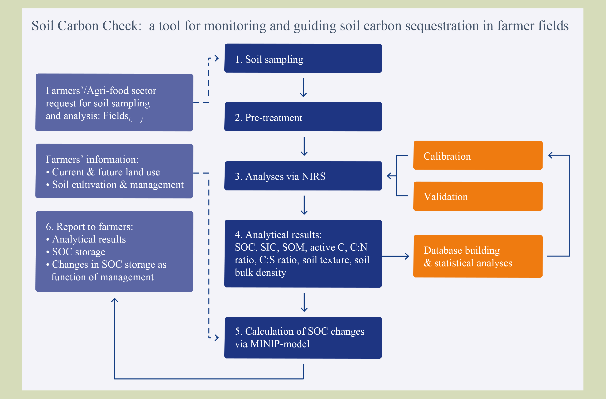 In 2015, 17 Sustainable Development Goals (SDGs) were approved, including SDG13, which addresses actions to increase carbon capture (CO2-C storage) for climate change mitigation. However, no analytical procedures have been defined for quantifying soil organic carbon (SOC) sequestration. This paper presents a rapid tool for guiding farmers and for monitoring SOC sequestration in farmer fields. The tool consists of multiconstituent soil analyses through near-infrared spectroscopy (NIRS) and an SOC mineralization model. The tool provides forecasts of SOC sequestration over time. Soil analyses by NIRS have been calibrated and validated for farmer fields in European countries, China, New Zealand, and Vietnam. Results indicate a high accuracy of determination for SOC (R2≥ 0.93), and for inorganic C, soil texture, and soil bulk density. Permanganate oxidizable soil C is used as proxy for active SOC, to detect early management-induced changes in SOC contents, and is also quantified by NIRS (R2 = 0.92). A pedotransfer function is used to convert the results of the soil analyses to SOC sequestration in kg·ha−1 C as well as CO2. In conclusion, the tool allows fast, quantitative, and action-driven monitoring of SOC sequestration in farmer fields, and thereby is an essential tool for monitoring progress of SDG13.