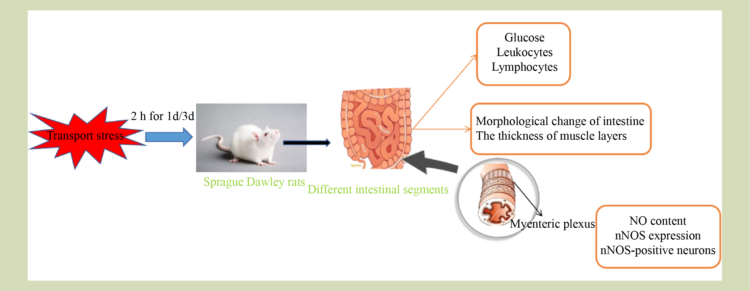 ● Transport stress declined the level of leukocytes including lymphocytes in rat serum. ● Transport stress destroyed intestinal integrity of rat. ● The muscular layer thickness of intestine was decreased after transport stress. ● nNOS expression and nNOS-positive neurons were reduced in rat after transport stress.