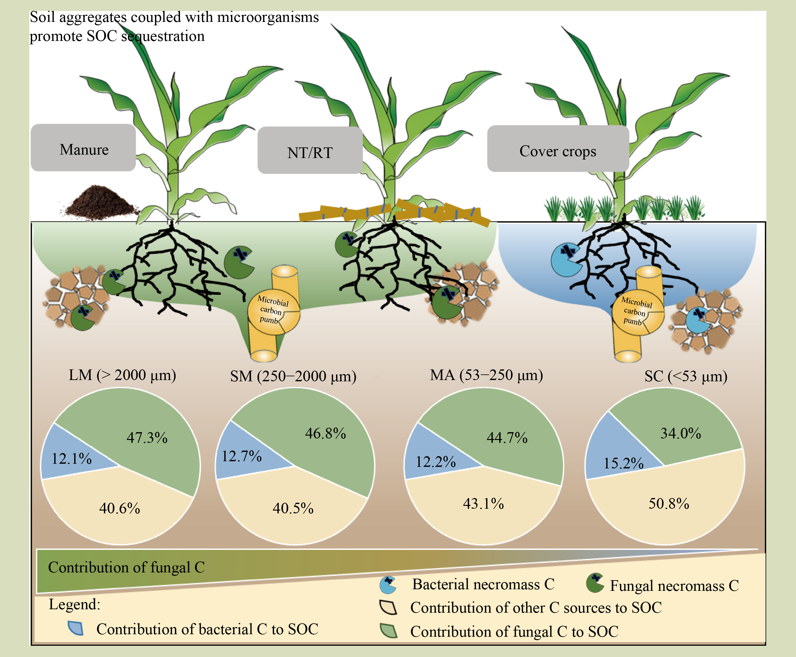 The interactions of soil microorganisms and structure regulate the degradation and stabilization processes of soil organic carbon (SOC). Microbial necromass is a persistent component of SOC, and its magnitude of accumulation dependent on management and aggregate sizes. A meta-analysis of 121 paired measurements was conducted to evaluate the management effects on contributions of microbial necromass to SOC depending on aggregate fractions. Results showed that the contribution of fungal necromass to SOC increased with aggregate sizes, while bacterial necromass had a higher proportion in silt and clay. Cropland management increased total and fungal necromass in large macroaggregates (47.1% and 45.6%), small macroaggregates (44.0% and 44.2%), and microaggregates (38.9% and 37.6%). Cropland management increased bacterial necromass independent of aggregate fraction sizes. Greater fungal necromass was increased in macroaggregates in response to manure (26.6% to 28.5%) and no or reduced tillage (68.0% to 73.5%). Cover crops increased bacterial necromass by 25.1% in small macroaggregates. Stimulation of microbial necromass was proportional to the increases of SOC within soil aggregates, and the correlation was higher in macroaggregates. Increasing microbial necromass accumulation in macroaggregates can, therefore, be considered as a central component of management strategies that aim to accelerate C sequestration in agricultural soils.