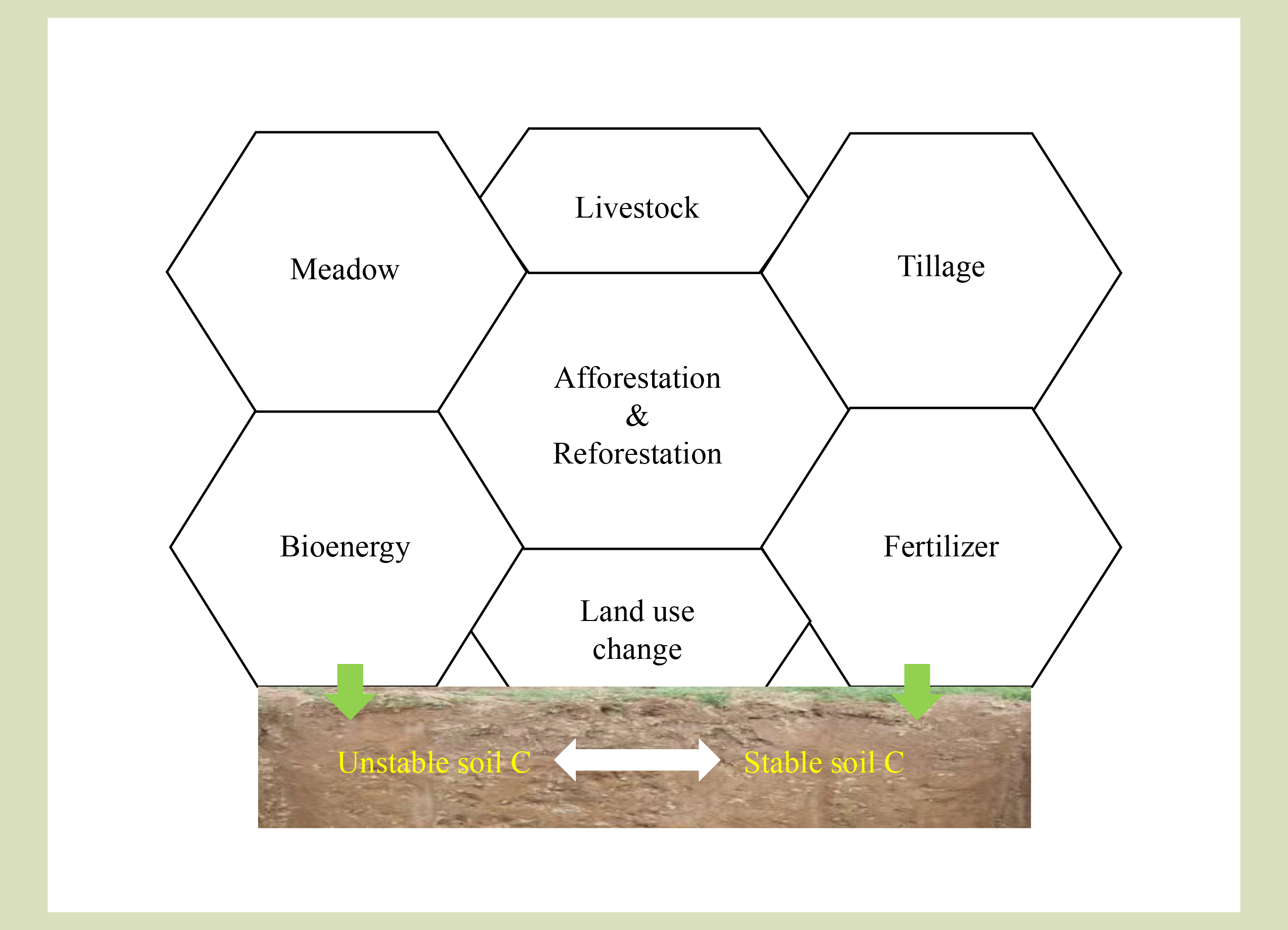 ● Either increasing C input to or reducing C release from soils can enhance soil C sequestration. ● Afforestation and reforestation have great potential in improving soil C sequestration. ● Long-term observations about the impacts of biochar on soil C sequestration are necessary.