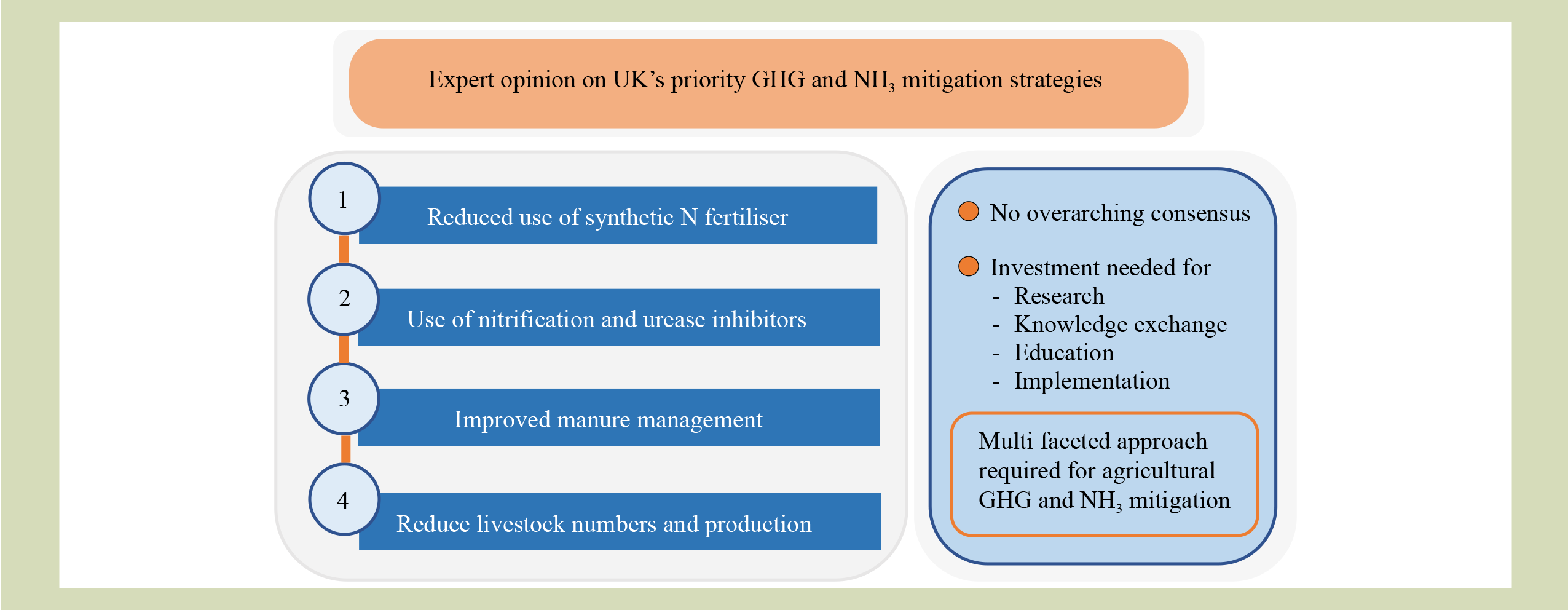 ● An expert survey highlighted the most effective strategies for GHG and ammonia mitigation. ● Interventions considered to have the highest mitigation potential are discussed. ● Experts agreed that no single mitigation measure can uniquely deliver GHG and ammonia mitigation. ● Experts noted a need for further investment in research, knowledge exchange, education and to develop implementation pathways. ● There is a need for more data to better quantify mitigation potentials and implement effective management strategies.