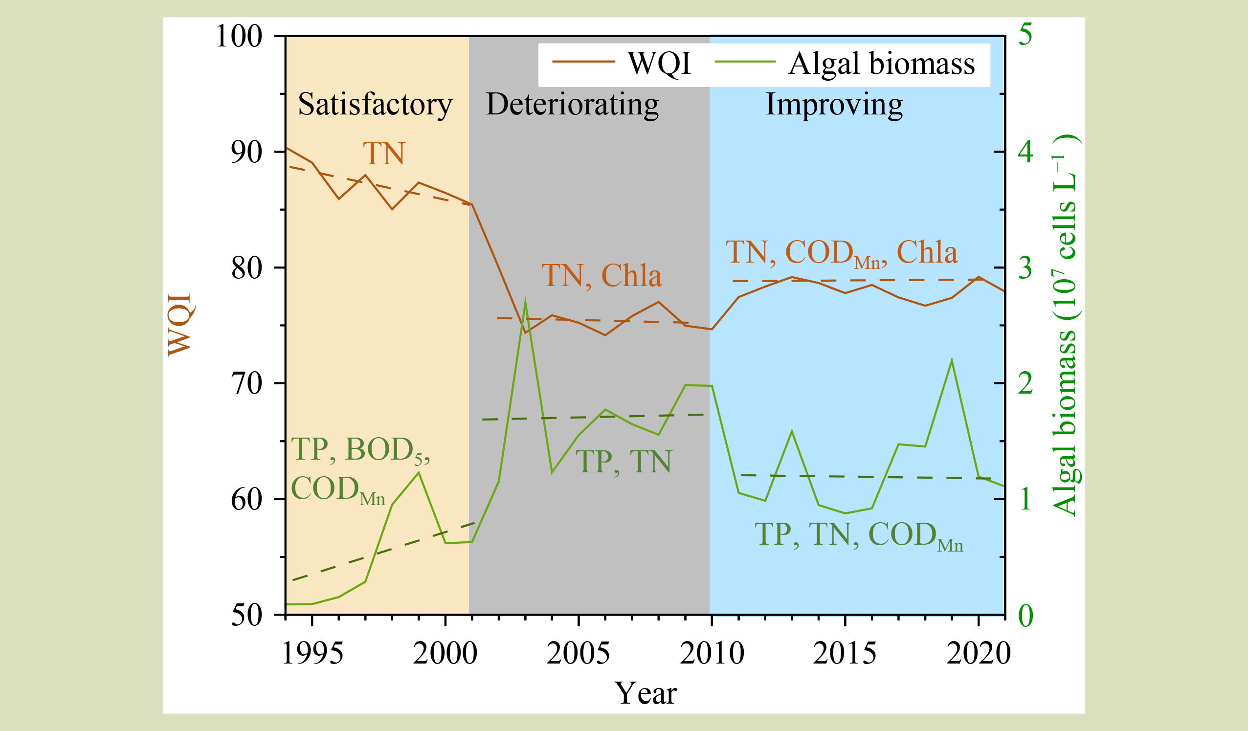 Elucidating the spatiotemporal pattern of water quality and algal biomass is crucial for accurately tracing pollution sources and reducing the risk of algal blooms in lake systems. This study analyzed the spatiotemporal variability of water quality and algal biomass in Erhai Lake from 1994 to 2021 using water quality index (WQI), Mann-Kendall test and Sen’s slope combined methods. The potential causes of water quality deterioration and algal biomass dynamics were also elucidated. The results showed that the historical changes in the water environment of Erhai Lake mainly had three stages: satisfactory (1994‒2001), deteriorating (2002‒2010) and improving (2011‒2021). The changes in water quality and algal biomass were primarily affected by total nitrogen, total phosphorus and chemical oxygen demand in different stages. The water environment of Erhai Lake is currently improving significantly, starting in the southern area that is furthest from the sources of agricultural pollution, especially in summer and autumn. This is attributed to the implementation of control measures resulting in lower pollutant loads at particular times and places. Therefore, it is necessary to continue to promote standardized livestock farming, to strengthen rural wastewater collection and to investigate measures such as the interruption of the endogenous cycle.