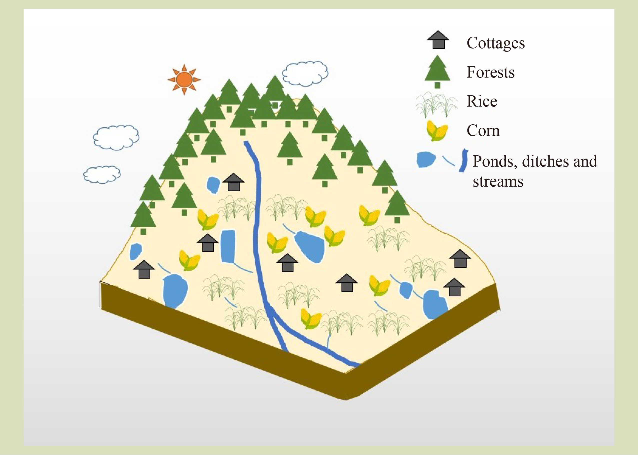 As the common features of agroecosystems, ditches and ponds benefit the irrigation and drainage, as well as intercepting non-point source pollutants. However, most ditch-pond studies have been conducted in lowland areas. To test this source-sink assumption in upland areas, this study made observations on the ecological function of the ditch and pond system in a typical catchment in China. First, the changes in ponds in the catchment were analyzed using high-resolution remote sensing data. Then, the migration of agricultural pollutants in ditches and ponds were analyzed by field sampling and laboratory detection. The results showed that over the past 15 years the length of ditches in the catchment and the number of small ponds (< 500 m2) have increased by 32% and 75%, respectively. The rate of change in nutrient concentrations in the ditches and ponds were mostly from −20% to 20%, indicating ditches and ponds can be both sources and sinks for agricultural pollutants. Lastly, the contributing factors were explored and it was found that ditches and ponds are important sinks in dry season. However, during the rainy season, ditches and ponds become sources of pollutants, with the rapid drainage of ditches and the overflow of ponds in upland areas. The results of this study revealed that the ditches and ponds could be used for ecological engineering in upland catchments to balance drainage and intercept pollutants.