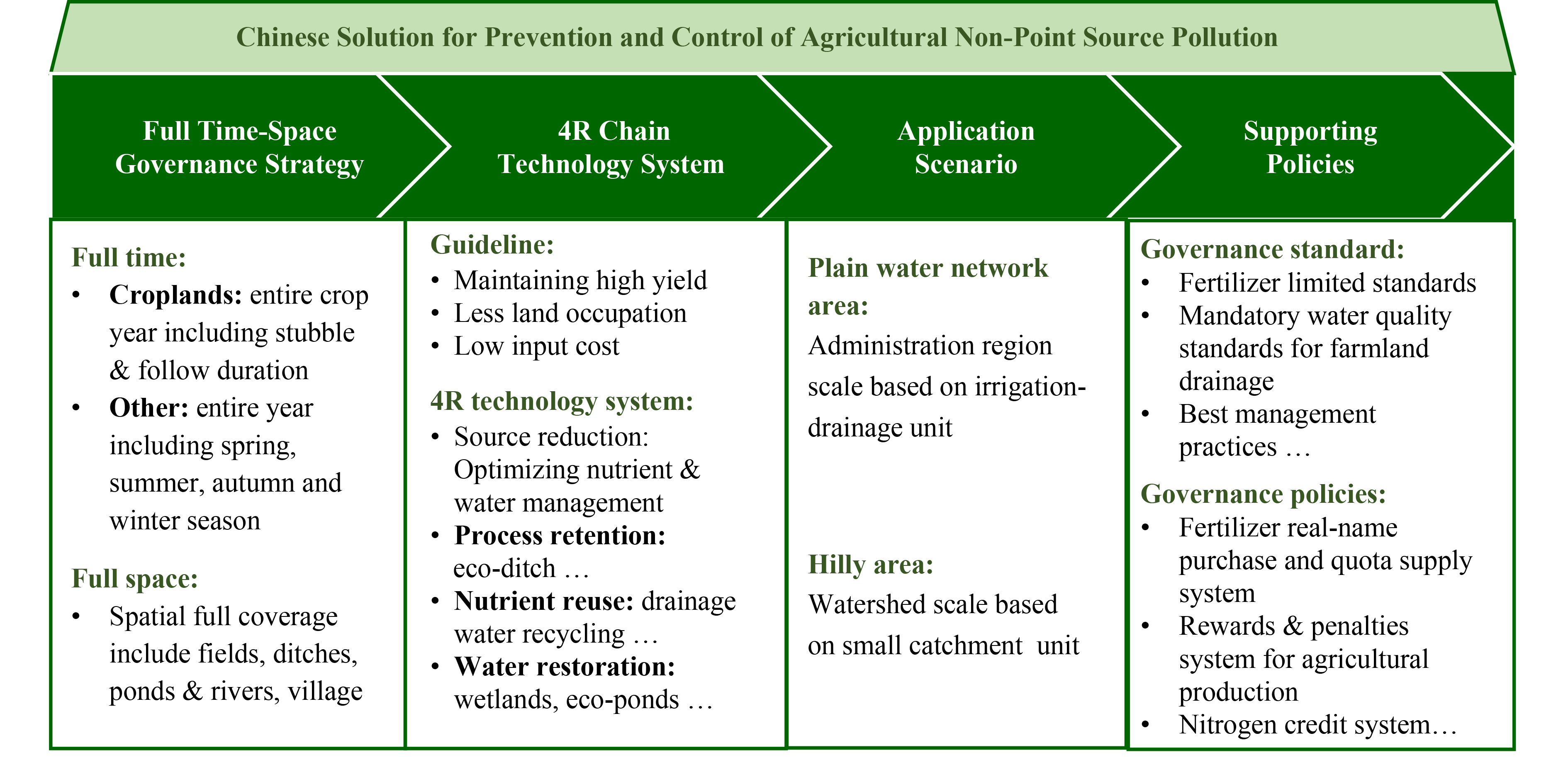 Ensuring food safety while reducing agricultural non-point source pollution is quite challenging, especially in developing and underdeveloped countries. Effective systematic strategies and comprehensive technologies need to be developed for agricultural non-point source pollution control at the watershed scale to improve surface water quality. In this review, a proposal is made for a full time-space governance strategy that prioritizes source management followed by endpoint water pollution control. The 4R chain technology system is specifically reviewed, including source reduction, process retention, nutrient reuse and water restoration. The 4R chain technology system with the full time-space governance strategy was applied at the scale of an administrative village and proved to be a feasible solution for reducing agricultural non-point source pollution in China. In the future, a monitoring system needs to be established to trace N and P transport. Additionally, new smart fertilizer and intelligent equipment need to be developed, and relevant governance standards and supportive policies need to be set to enhance the efficacy of agricultural non-point source pollution control.