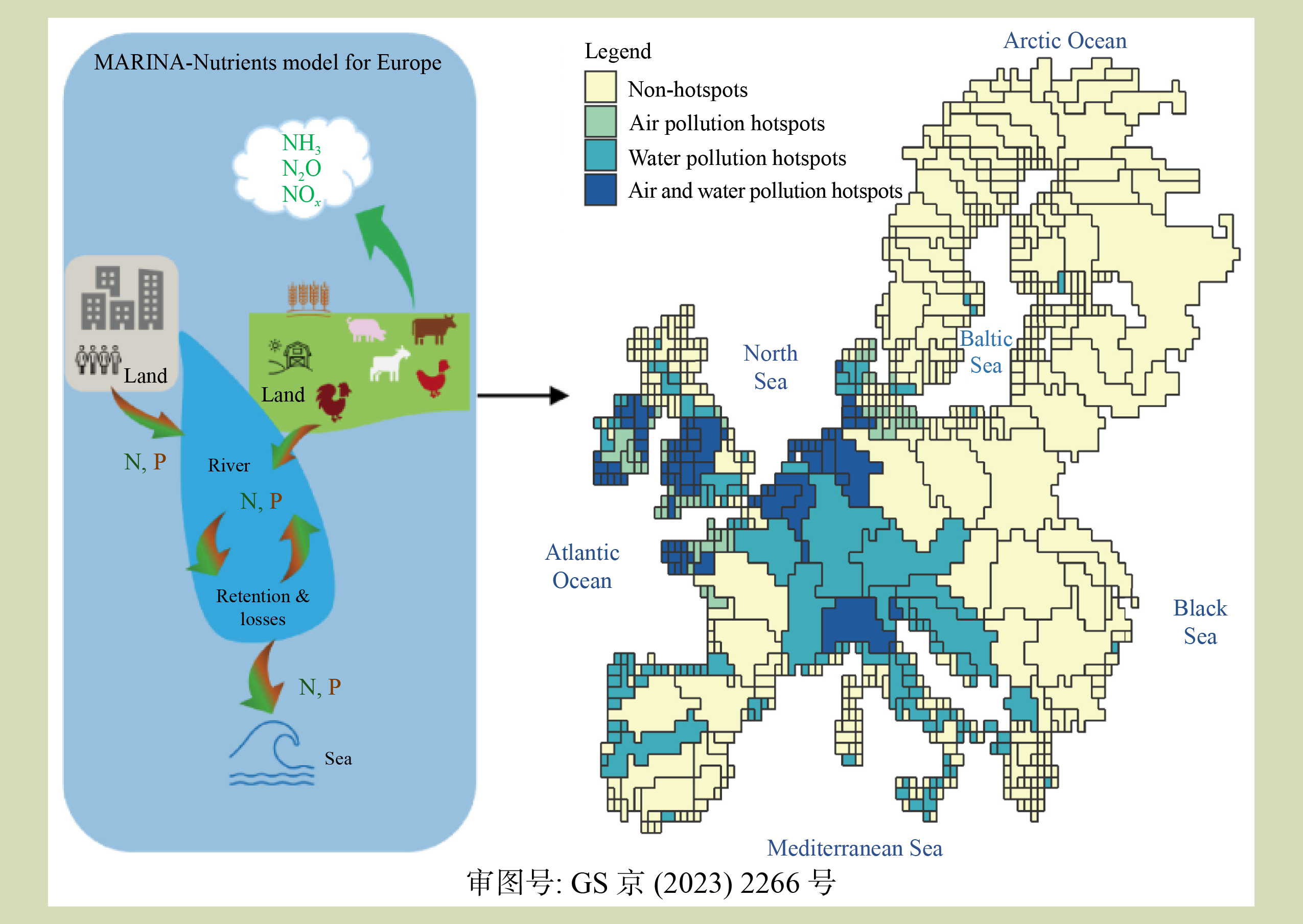 Nutrient pollution of air and water is a persistent problem in Europe. However, the pollution sources are often analyzed separately, preventing the formulation of integrative solutions. This study aimed to quantify the contribution of agriculture to air, river and coastal water pollution by nutrients. A new MARINA-Nutrients model was developed for Europe to calculate inputs of nitrogen (N) and phosphorus (P) to land and rivers, N emissions to air, and nutrient export to seas by river basins. Under current practice, inputs of N and P to land were 34.4 and 1.8 Tg·yr–1, respectively. However, only 12% of N and 3% of P reached the rivers. Agriculture was responsible for 55% of N and sewage for 67% of P in rivers. Reactive N emissions to air from agriculture were calculated at 4.0 Tg·yr–1. Almost two-fifths of N emissions to air were from animal housing and storage. Nearly a third of the basin area was considered as pollution hotspots and generated over half of N emissions to air and nutrient pollution in rivers. Over 25% of river export of N ended up in the Atlantic Ocean and of P in the Mediterranean Sea. These results could support environmental policies to reduce both air and water pollution simultaneously, and avoid pollution swapping.