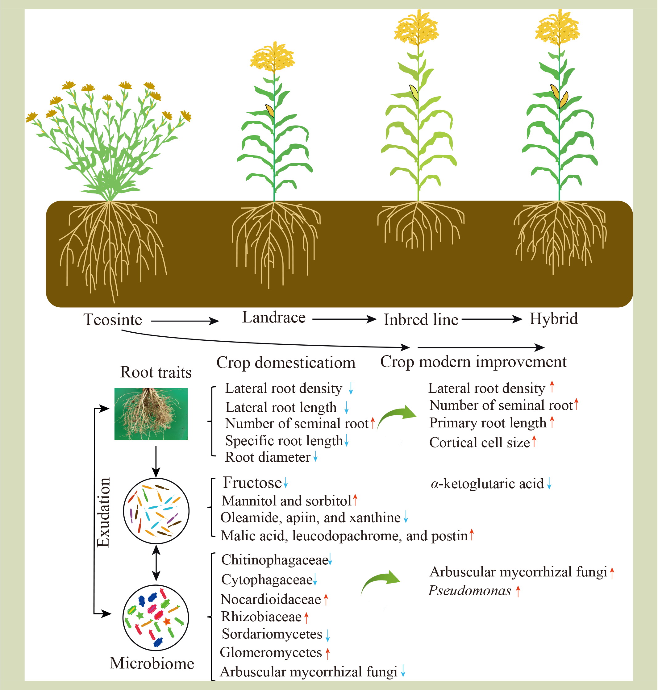 Beneficial root-microbiome interactions offer enormous potential to improve crop performance and stress tolerance. Domestication and improvement reduced the genetic diversity of crops and reshaped their phenotypic traits and their associated microbiome structure and function. However, understanding of the genetic and physiological mechanisms how domestication and improvement modulated root function, microbiome assembly and even co-selective patterns remains largely elusive. This review summarizes the current status of how crop domestication and improvement (heterosis) affected root characteristics and their associated microbiome structure and function. Also, it assesses potential mechanisms how crop domestication and improvement reshaped root-microbiome association through gene regulation, root structure and function and root exudate features. A hypothetical strategy is proposed that entangles crop genetics and abiotic interactions with beneficial microbiomes to mitigate the effects of global climate change on crop performance. A comprehensive understanding of the role of crop domestication and improvement in root-associated microbiome interaction will advance future breeding efforts and agricultural management.