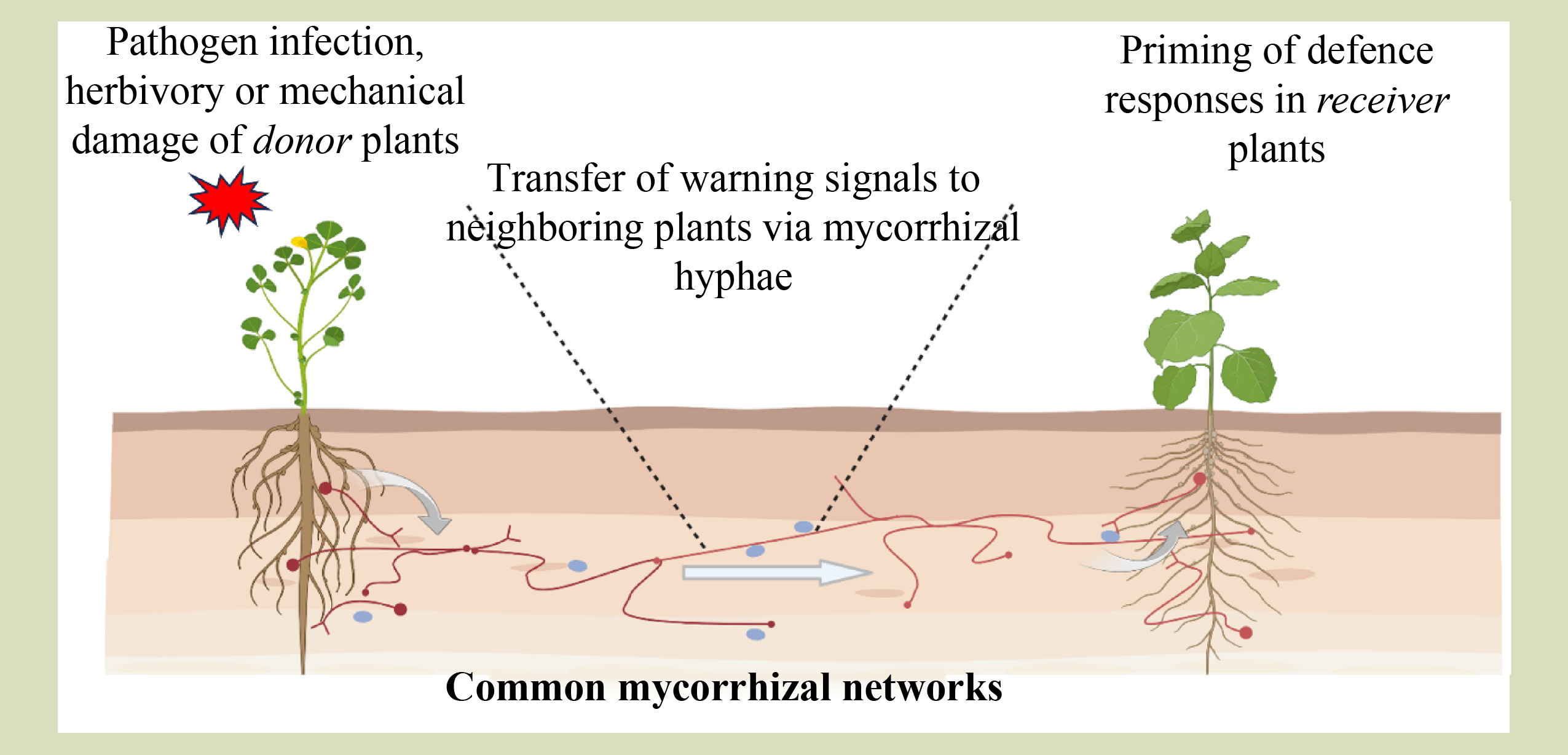 Interplant communication is of vital importance for plant performance in natural environments. Mycorrhizal fungi have emerged as key contributors to the below ground communication between plants. These mutualistic fungi form connections between the roots of plants via their hyphae, known as common mycorrhizal networks (CMNs). These hyphal networks are thought to be important ways for the exchange of signals between plants. This paper reviews the evidence for CMN-based transfer of semiochemicals between plants upon exposure to pathogen infection, herbivory or mechanical damage. Potential transport routes are explored, asking whether the fungi can actively contribute to the distribution of such signals within the network and discussing potential drivers for signal exchange. It is concluded that identification of the signals that are exchanged remains an important challenge for the future.