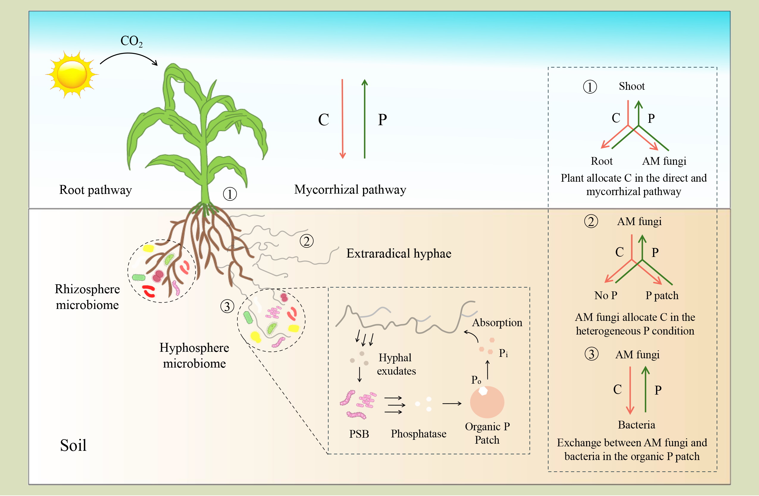 To efficiently obtain P from soil, most terrestrial plants form symbiosis with arbuscular mycorrhizal (AM) fungi and thus have two P uptake pathways, i.e., the direct pathway (DP) via roots, particularly root hairs, and the mycorrhizal pathway (MP) via AM fungal hyphae. AM fungi form an extraradical hyphal network to expand their contact area with soil and release carbon-rich compounds, which provide a high-energy habitat for soil bacteria. The bacteria affected by AM fungi support P nutrition of AM fungi by secreting extracellular phosphatases. During the P acquisition process, both DP and MP function and require C fixed by plant photosynthesis to maintain P transport. Plants make trade-offs between DP and MP based on C inputs and P benefits. This review first systematically explores the potential trade-offs between plant C inputs and P gains of DP and MP as well as the factors that influence such trade-offs. Then the response of AM fungi to soil nutrient heterogeneity and the mechanisms by which AM fungi select bacteria to mineralize organic P and increase the P contribution of MP were analyzed. Future studies need to apply emerging methods and technologies to accurately quantify the contribution of DP and MP to plant P absorption under different conditions and provide the theoretical basis for optimizing sustainable agricultural production systems.