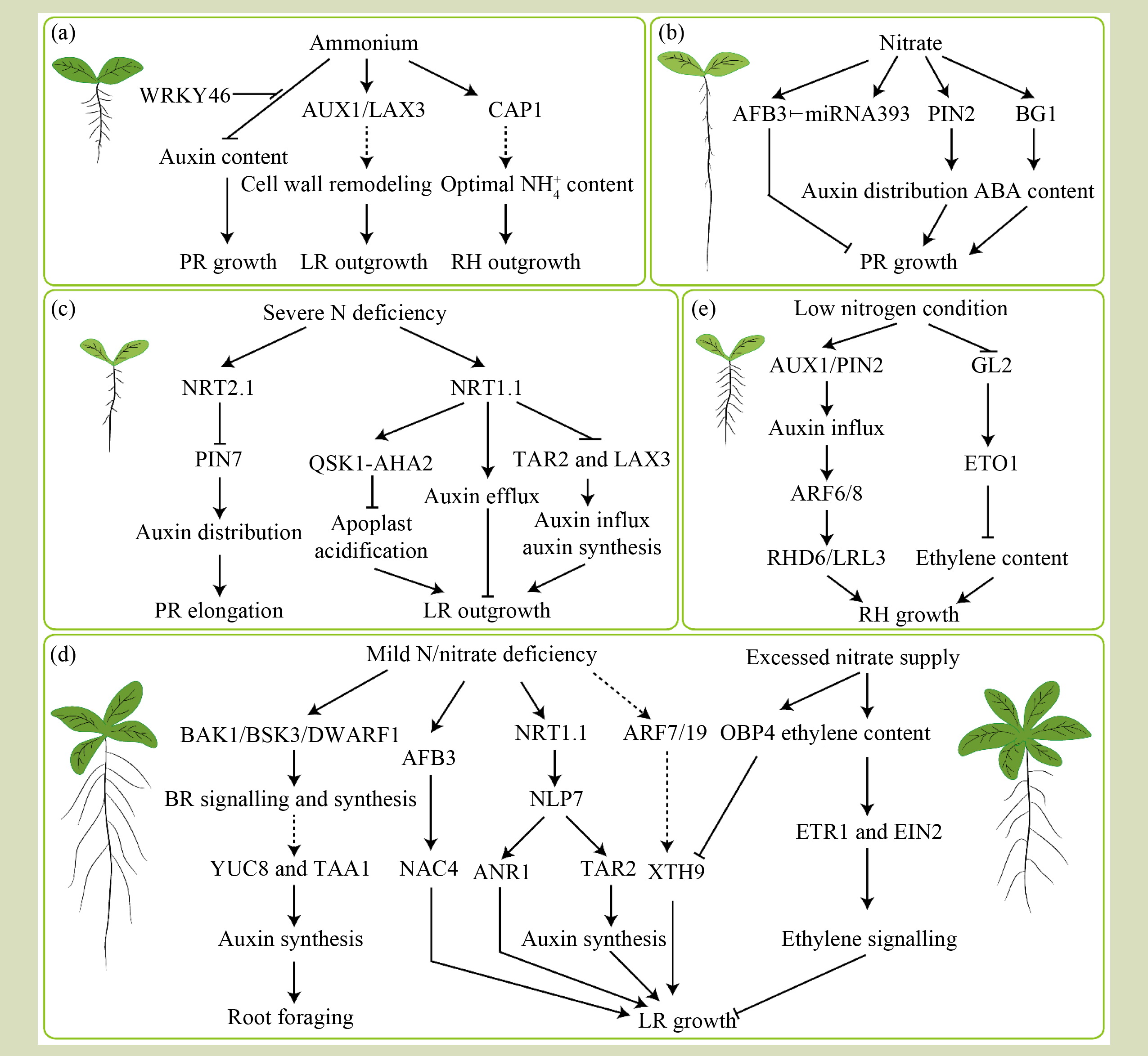 Download cover Download PDFsPlant roots are crucial for nitrogen uptake. To efficiently acquire N, root system architecture (RSA), which includes the length and quantity of primary roots, lateral roots and root hairs, is dynamically regulated by the surrounding N status. For crops, an ideotype RSA characterized by enhanced plasticity to meet various N demands under fluctuating N conditions is fundamental for high N utilization and subsequent yield. Therefore, exploring the genetic basis of N-dependent RSA, especially in crops, is of great significance. This review summarizes how plants sense both local and systemic N signals and transduce them to downstream pathways. Additionally, it presents the current understanding of genetic basis of N-dependent root plasticity in Arabidopsis and major crops. Also, to fully understand the mechanisms underlying N-dependent root morphogenesis and effectively identify loci associated with an ideotype RSA in crops, more attention should be paid to non-destructive, in situ phenotyping of root traits, cell-type-specific exploration of gene functions, and crosstalk between root architecture, environment and management in the future.