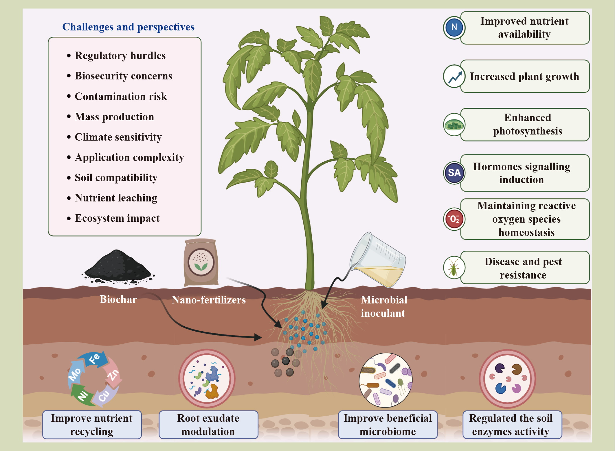 The achievement of global food security faces exceptional challenges due to the rapid population growth, land degradation and climate change. Current farming practices, including mineral fertilizers and synthetic pesticides, alone are becoming insufficient to ensure long-term food security and ecosystem sustainability. The lack of robustness and reliability of conventional approaches warrants efforts to develop novel alternative strategies. Bio-based management strategies offer promising alternatives for improving soil health and food productivity. For example, microbial inoculants can enhance nutrient availability, crop production and stress resistance while also remediating contaminated soils. Nanobiotechnology is a promising strategy that has great potential for mitigating biotic and abiotic stresses on plant toward sustainable agriculture. Biochar (including modified biochar) serves as an effective microbial carrier, improving nutrient availability and plant growth. Also, biochar amendments have been demonstrated to have great potential facilitating soil organic carbon sequestration and mitigating greenhouse gas emissions and therefore contribute to climate change mitigation efforts. This review examines the integration of microbial inoculants, nano-fertilizers and biochar, which demonstrates as a promising strategy to enhance soil health, crop productivity and environmental sustainability. However, overcoming challenges related to their mass production, application and potential risks remains crucial. Future research should focus on optimizing these bio-amendment strategies, evaluating their economic viability and developing robust regulatory frameworks to ensure safe and effective agricultural implementation.